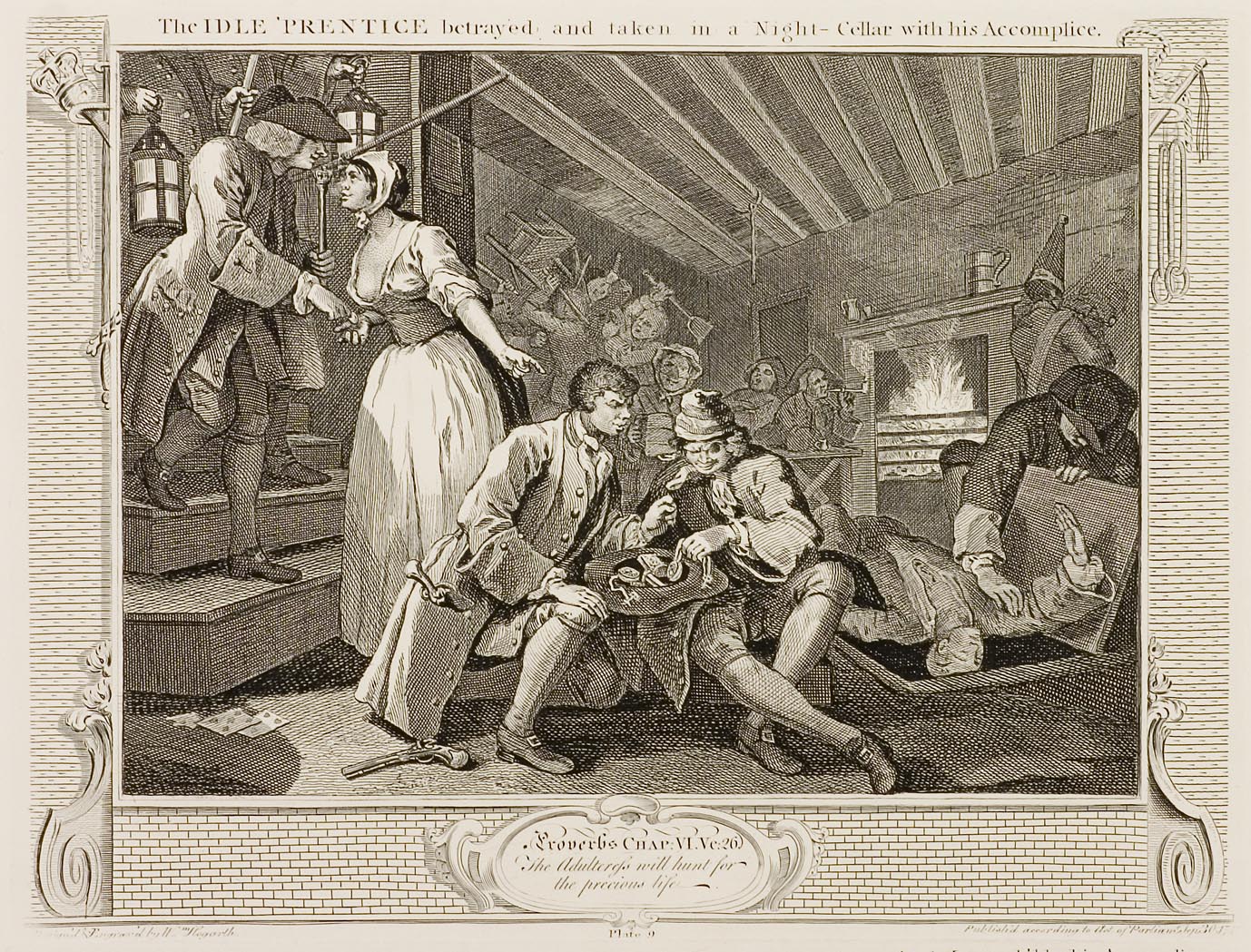 Plate 9: The Idle ‘Prentice betrayed and taken in a Night-Cellar with his Accomplice