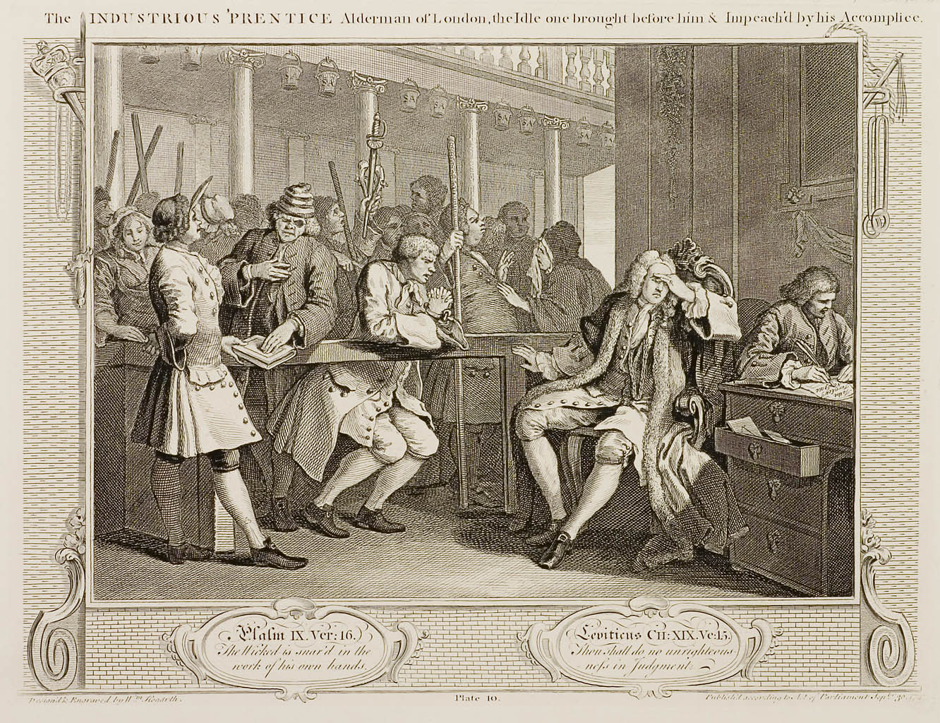 Plate 10: The Industrious ‘Prentice Alderman of London, the Idle one brought before him & Impeach’d by his Accomplice.