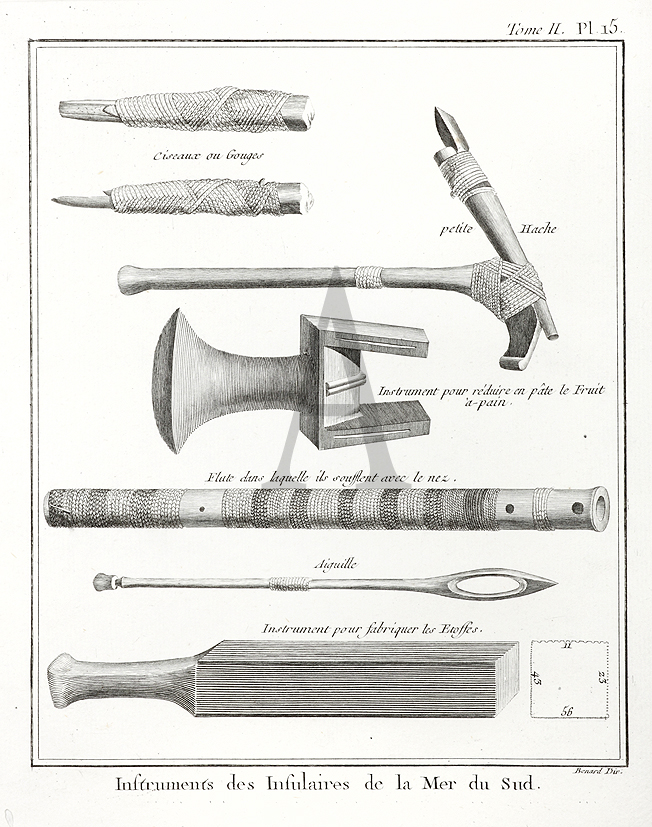Rare engraving of instruments of the South Sea Islanders. From the French edition of Cook’s voyages.