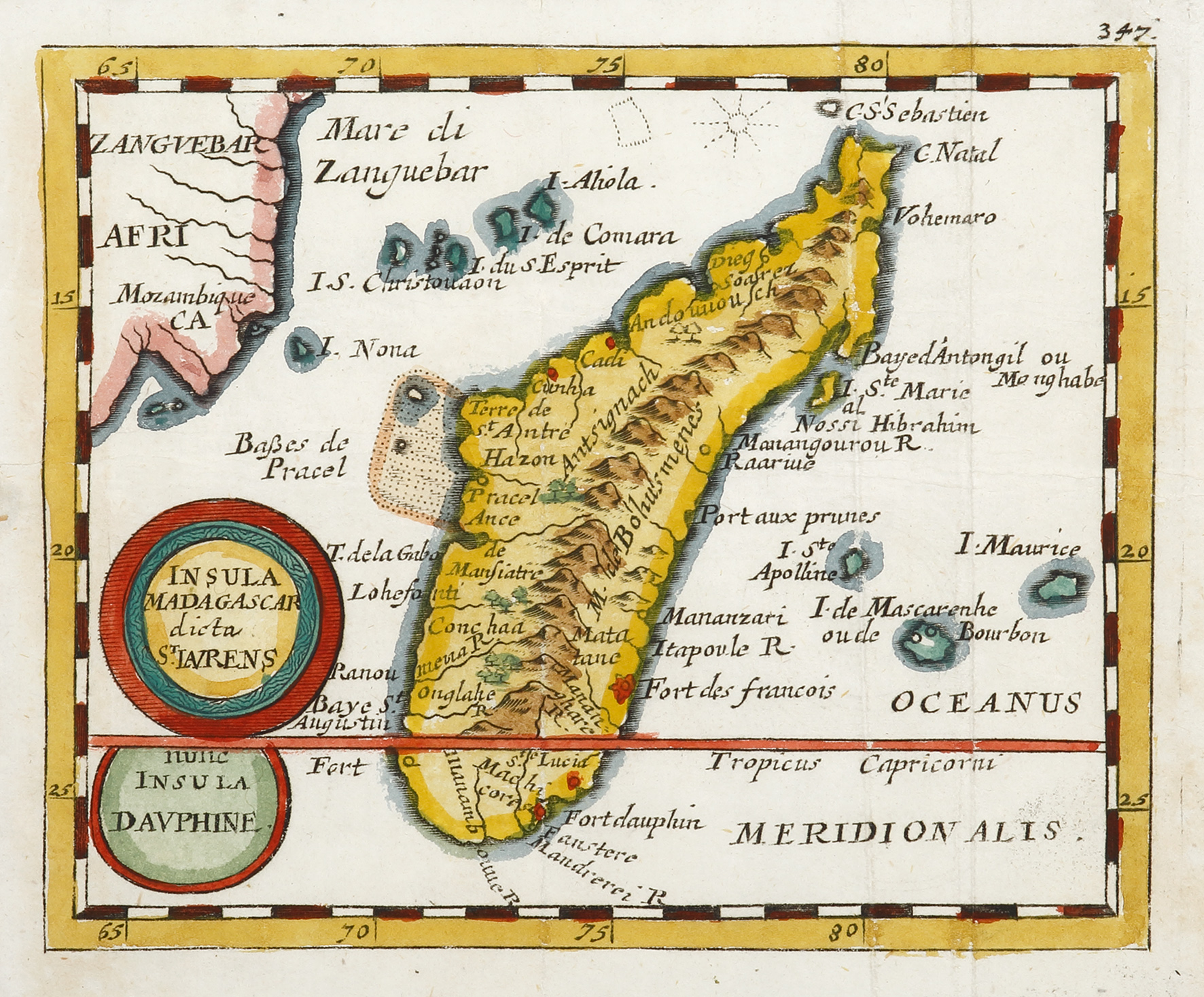 Rare early miniature map of Madagascar by Pierre Duval with circular title cartouche at lower left.