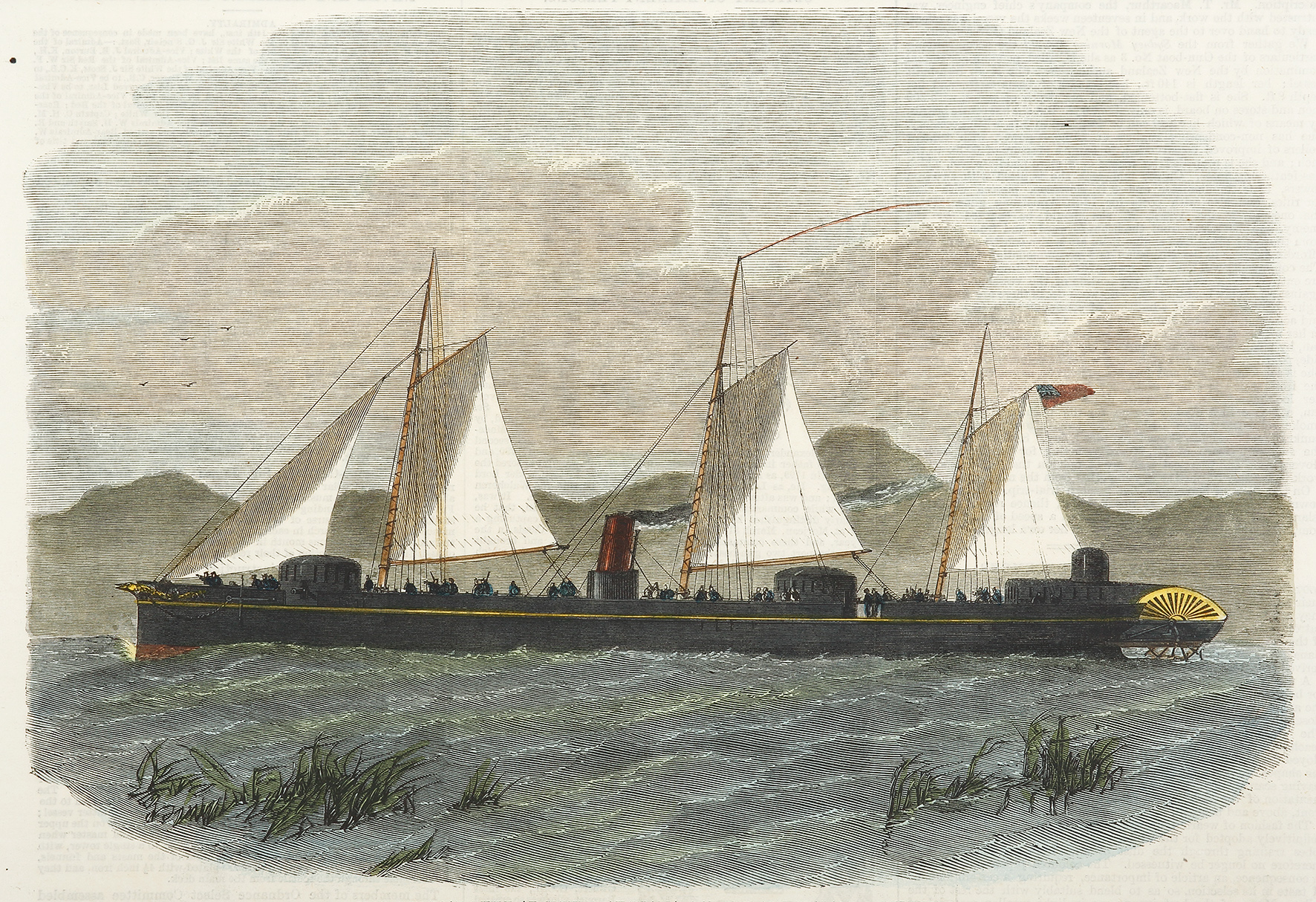 Colonial engraving of ‘Gun-Boat No. 3, built in Sydney for the New Zealand Government who needed shallow draught and highly manoeuvrable boats for navigating the rivers of the North Island. It was named Pioneer on its arrival in New Zealand. It was powered by a paddle steamer.