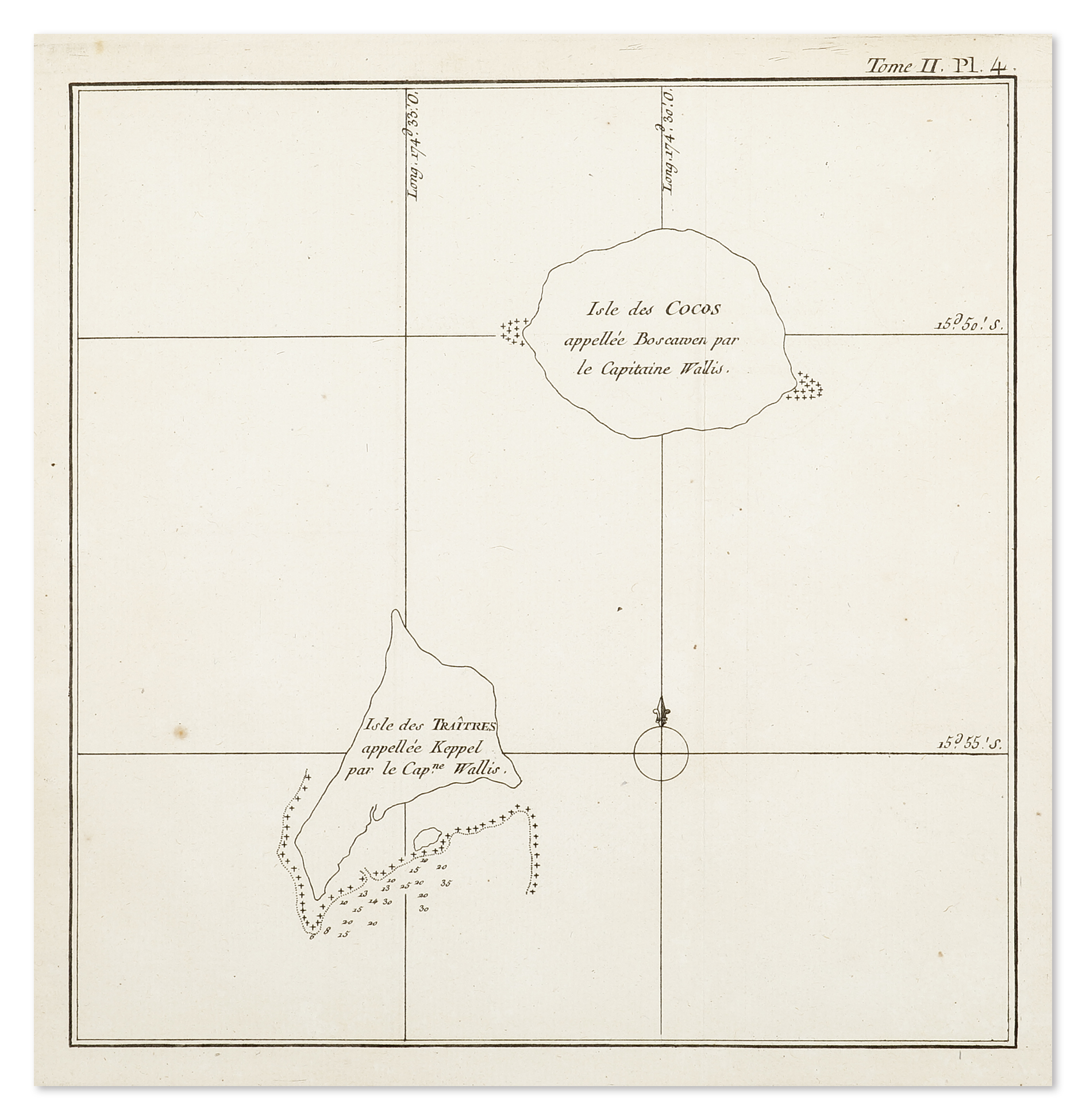 French edition of the map of the Cocos Island (Tafahi) and Traitors Island (Niuatoputapu). Both Islands are just north of Tonga. They are better known by the names Boscawen and Keppel given to them by Wallis in 1767, but the Tongan names are Tafahi and Niuatobutabu.