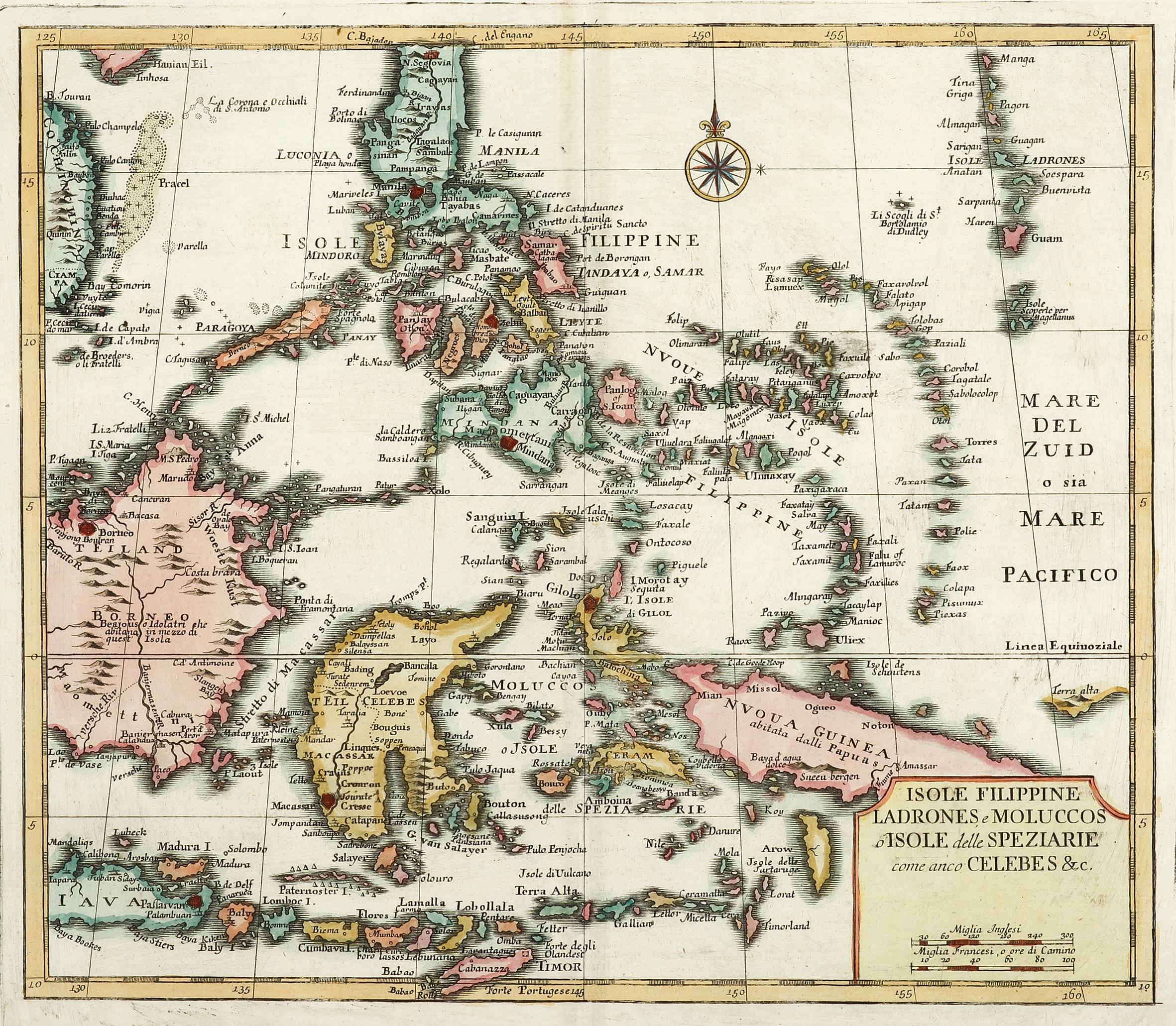 Rare map of South East Asia by Giovambattista Albrizzi, publisher, patron, collector and one of the great figures of eighteenth-century Venetian intellectual and cultural life. From: Albrizzi, Atlante Novissimo del Sigr. Guglielmo de L’Isle, Venezia. (volume Primo MDCCXL-1740)