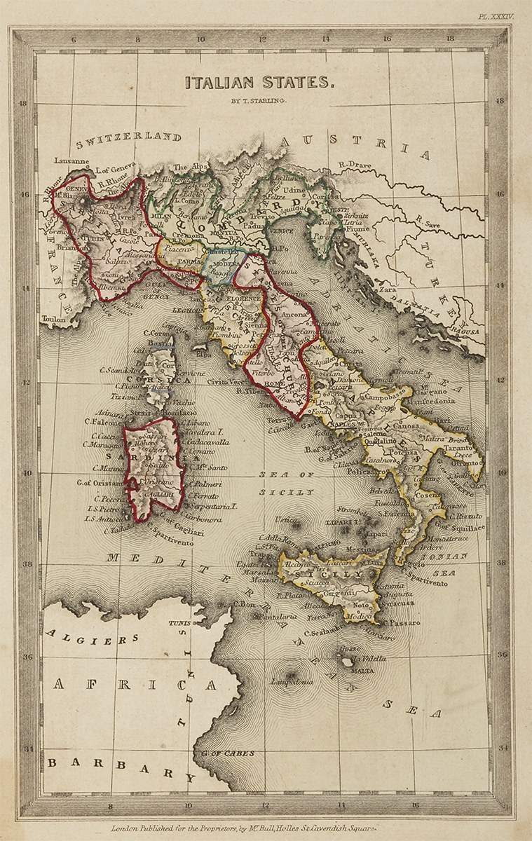 Finely engraved early c.19th miniature map of Italy by Thomas Starling (1796-1850).