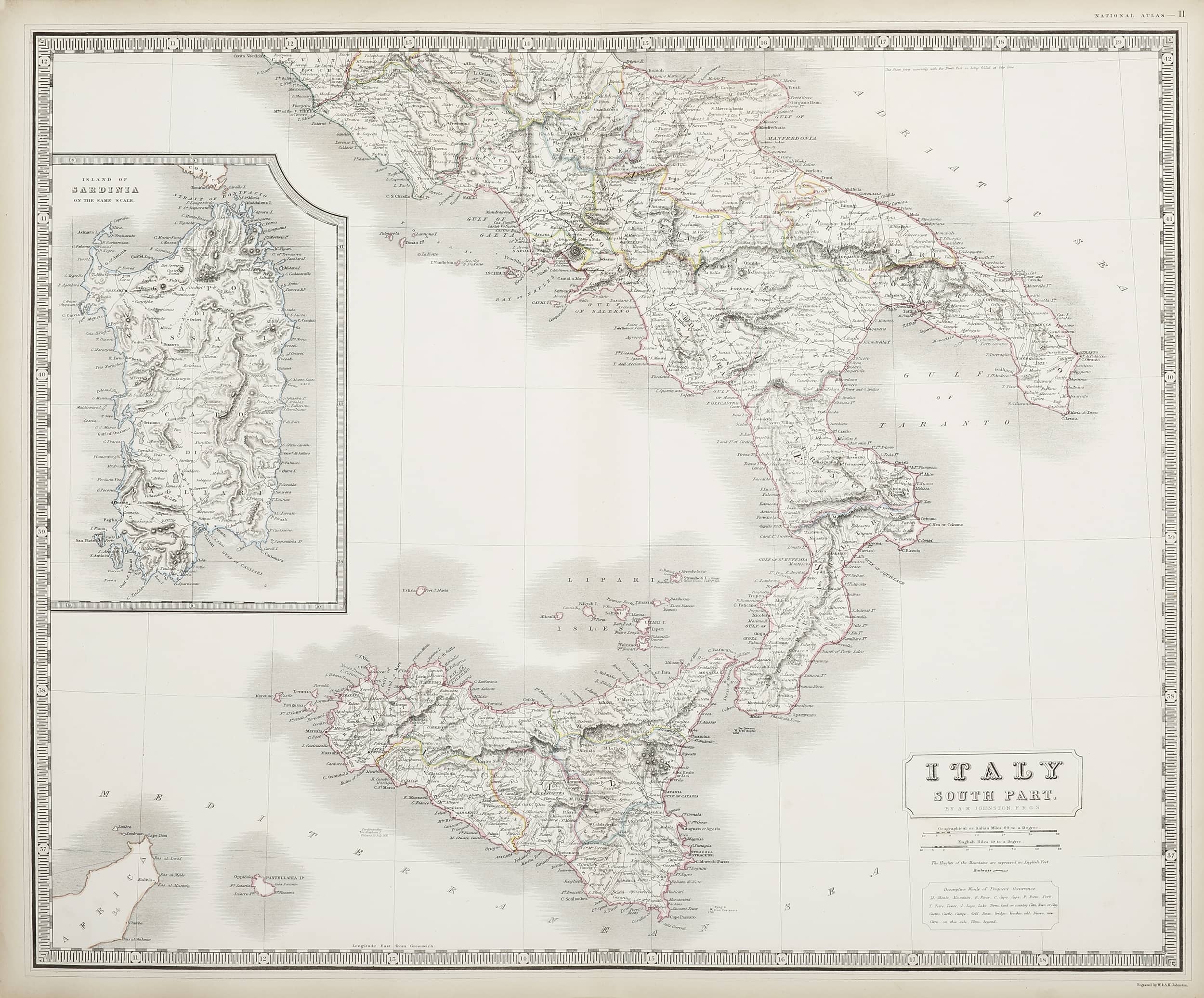 First edition of this large scale c.19th map of southern Italy by Alexander Keith Johnston (1804–1871) the Geographer Royal for Great Britain.