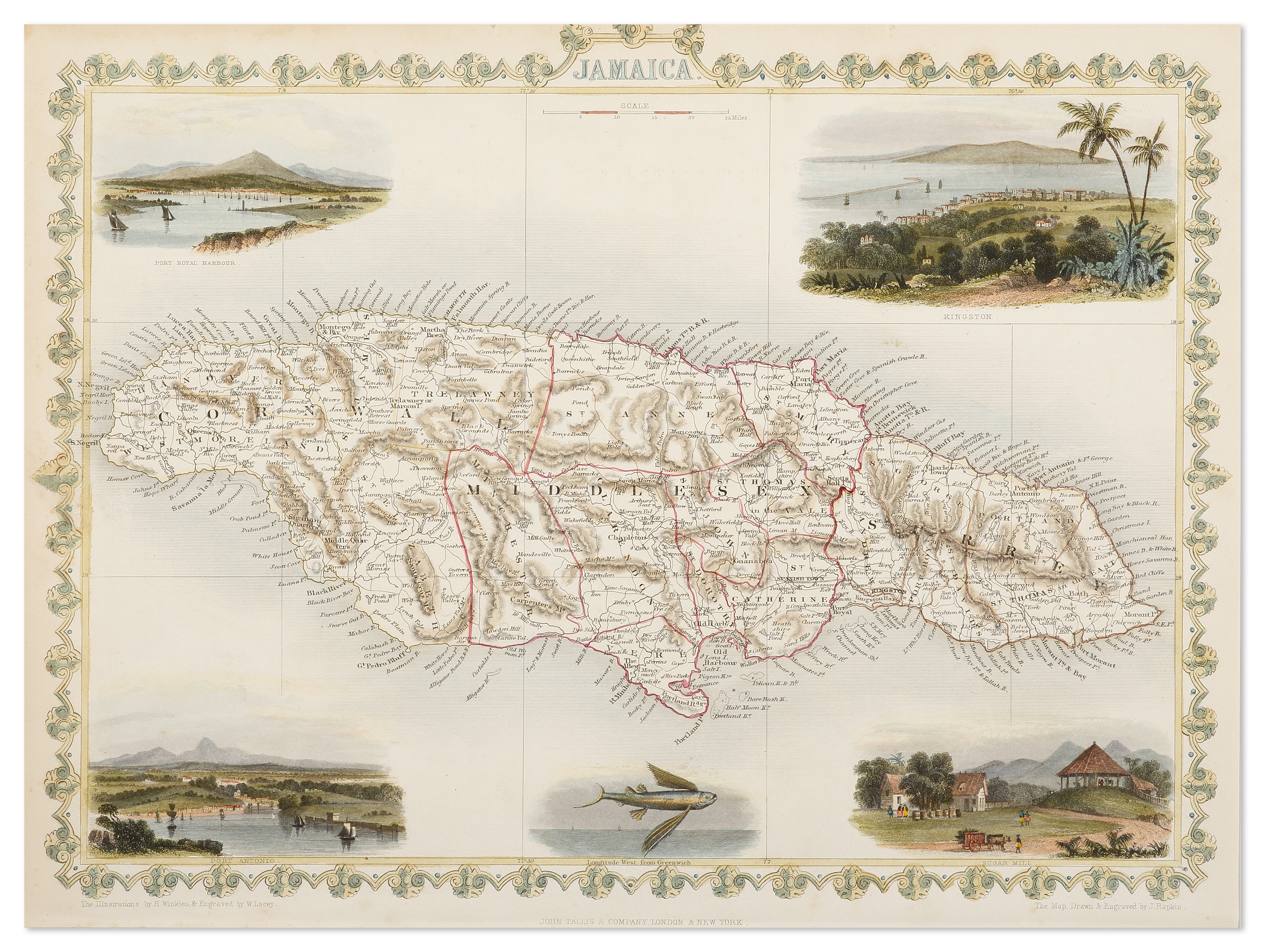 Fully hand coloured example of one the most decorative C19th maps of Jamaica from The Illustrated Atlas by John Tallis. With decorative border surrounds and vignettes views of: Kingston, Sugar Mill, ‘Flying fish’, Port Antonio, Port Royal Harbour.