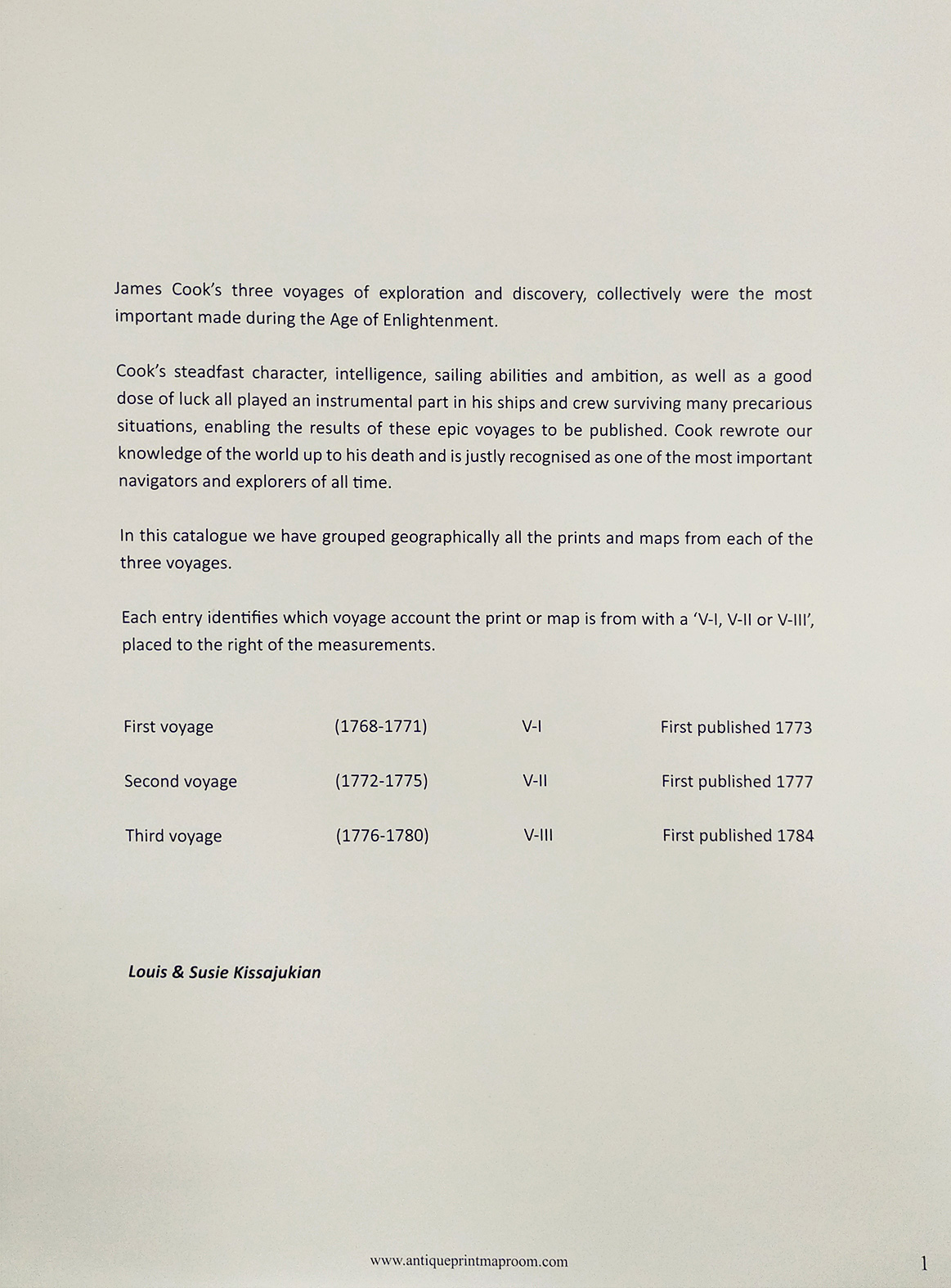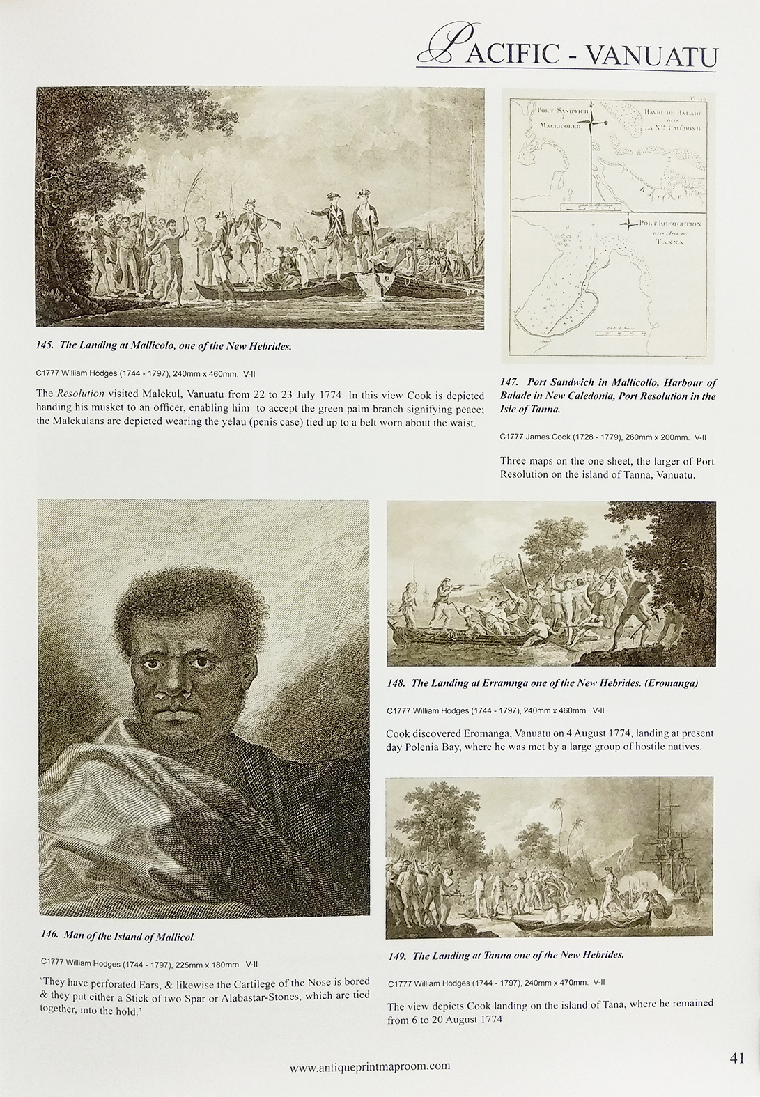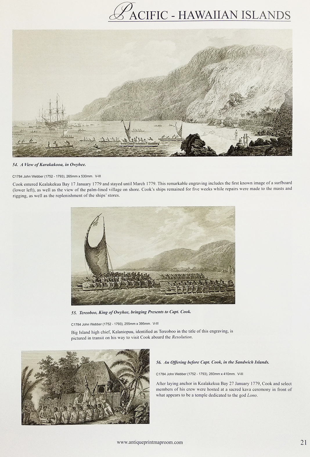 Fully illustrated catalogue containing all the published prints and maps from Cook’s three voyages of exploration from 1773-1784. As Cook revisited places numerous times not only on the same voyages but also subsequent voyages, we have arranged the grouping of the entries by geographic region and each entry notes which voyage account each item is from.