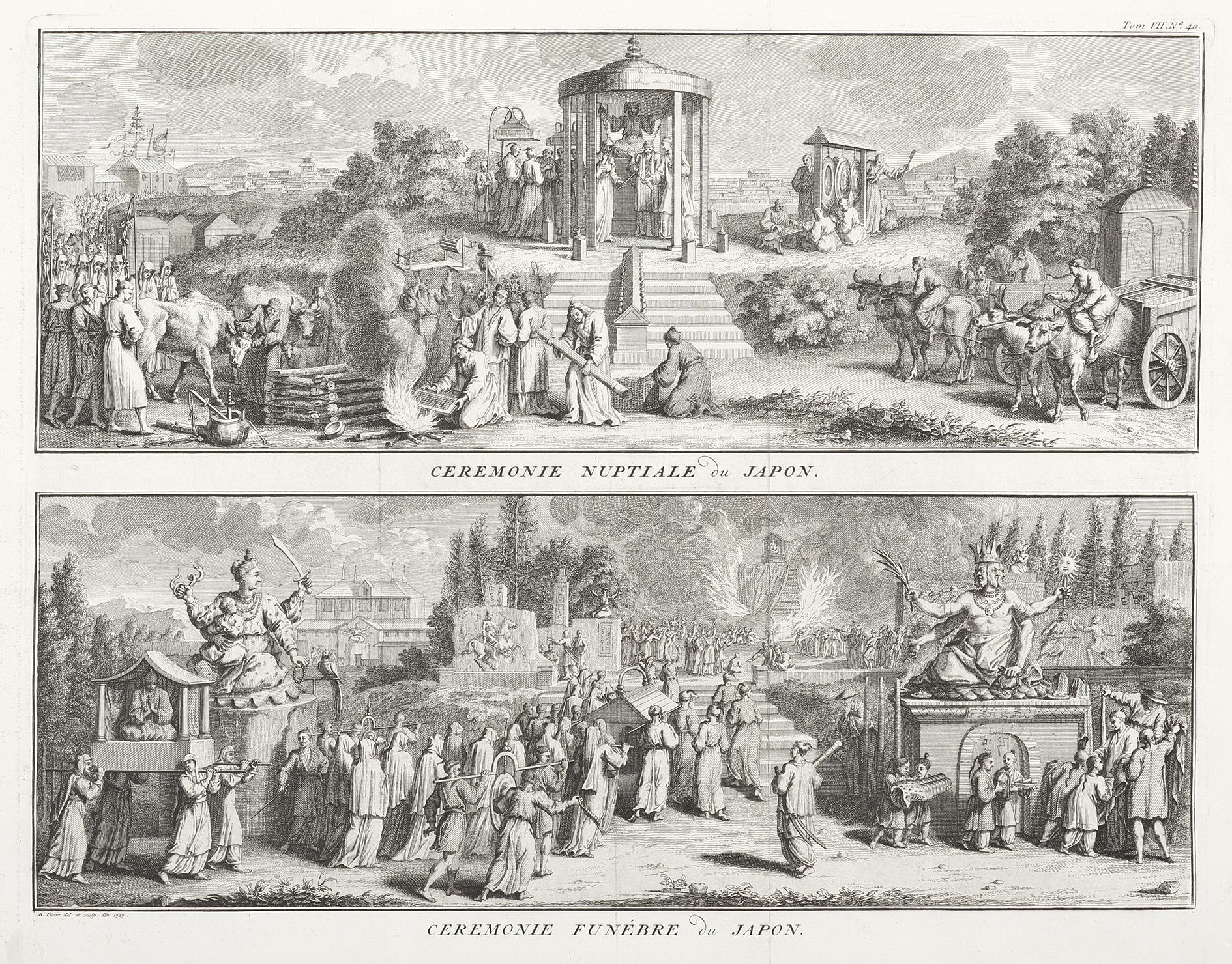Early engraving showing a wedding and funeral ceremony of Japan.