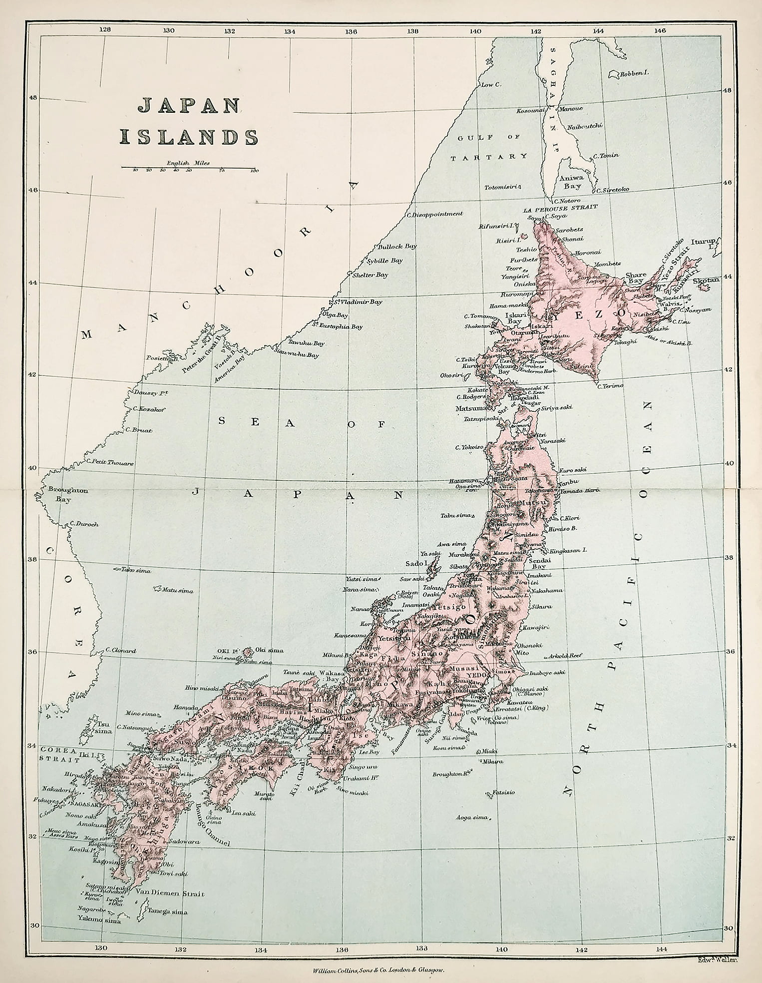 Detailed late c.19th map of Japan by John Bartholomew (1860-1920).