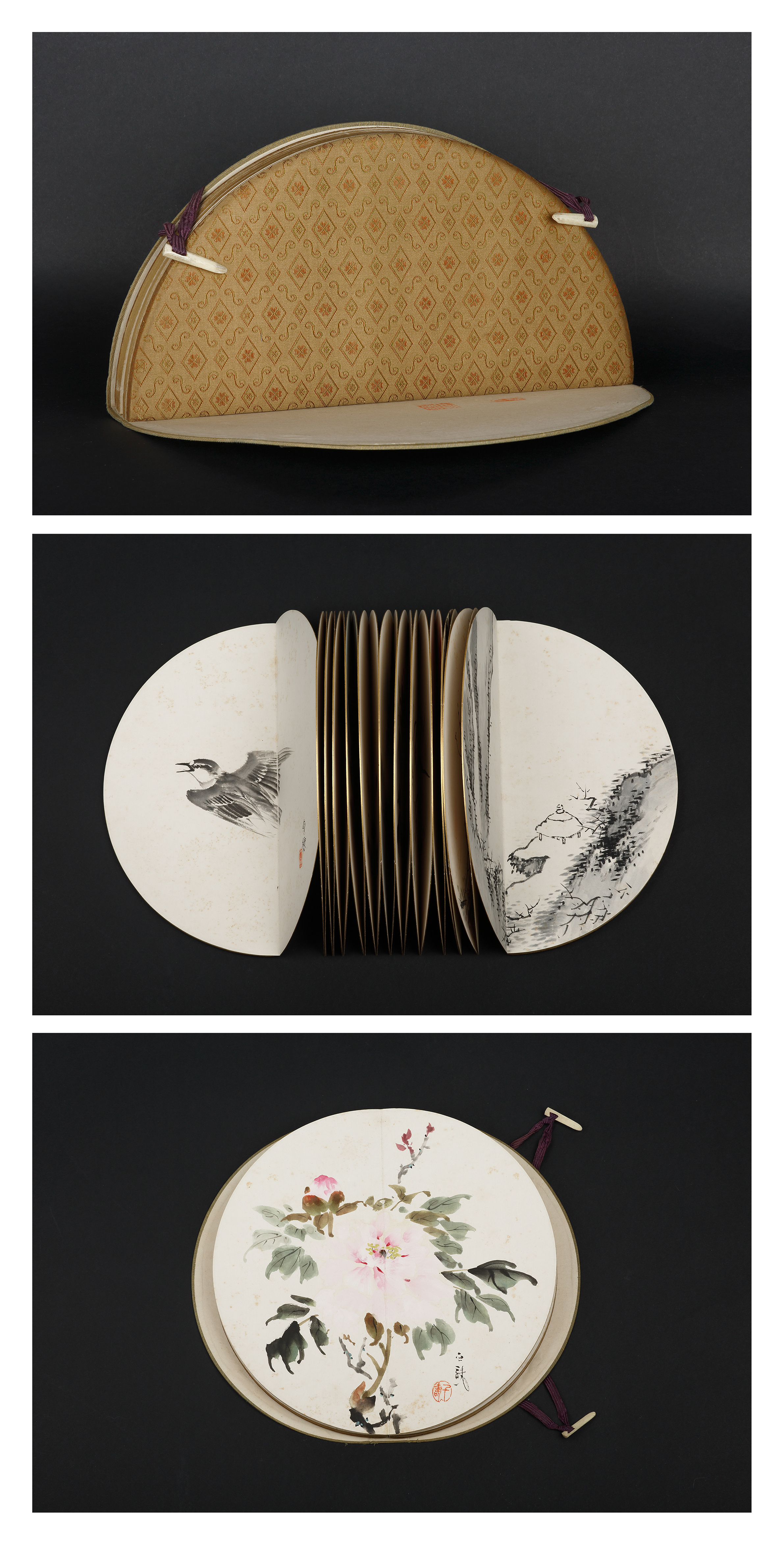 Beautifully presented watercolour album, in oval format Orihon (folding) binding with silk cloth covered boards, gilt page edges and traditional ties, in an oval album with fourteen signed and folded watercolours of Mount Fuiji, birds, trees.