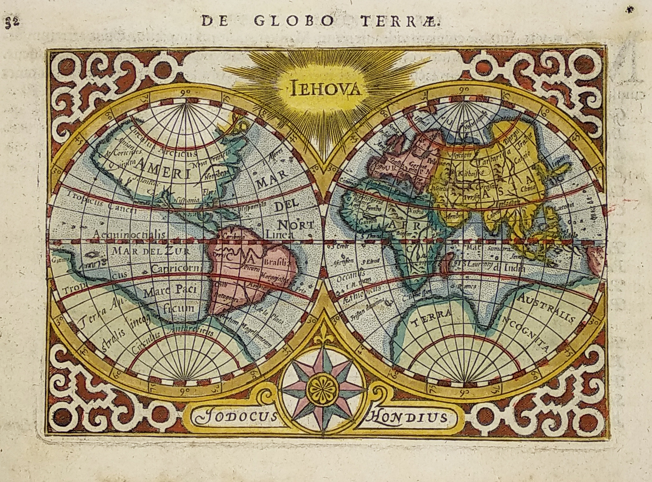 Hondius was born in Wakken and grew up in Ghent. He was an engraver, instrument maker and globe maker. In 1584 he moved to London to escape the religious persecution in Flanders. In 1593 he moved to Amsterdam and the publisher Cornelis Claesz. in 1604 he purchased the engraving plates for the Mercator’s Atlas. Hondius republished Mercator’s work with 36 additional maps, including several which he himself had produced. Despite the addition of his own contributions, Hondius gave Mercator full credit as the author of the work, listing himself as the publisher. Hondius’ new edition of Mercator’s work was a great success. From 1605 and 1610 he engraved the maps for John Speed’s The Theatre of the Empire of Great Britaine.