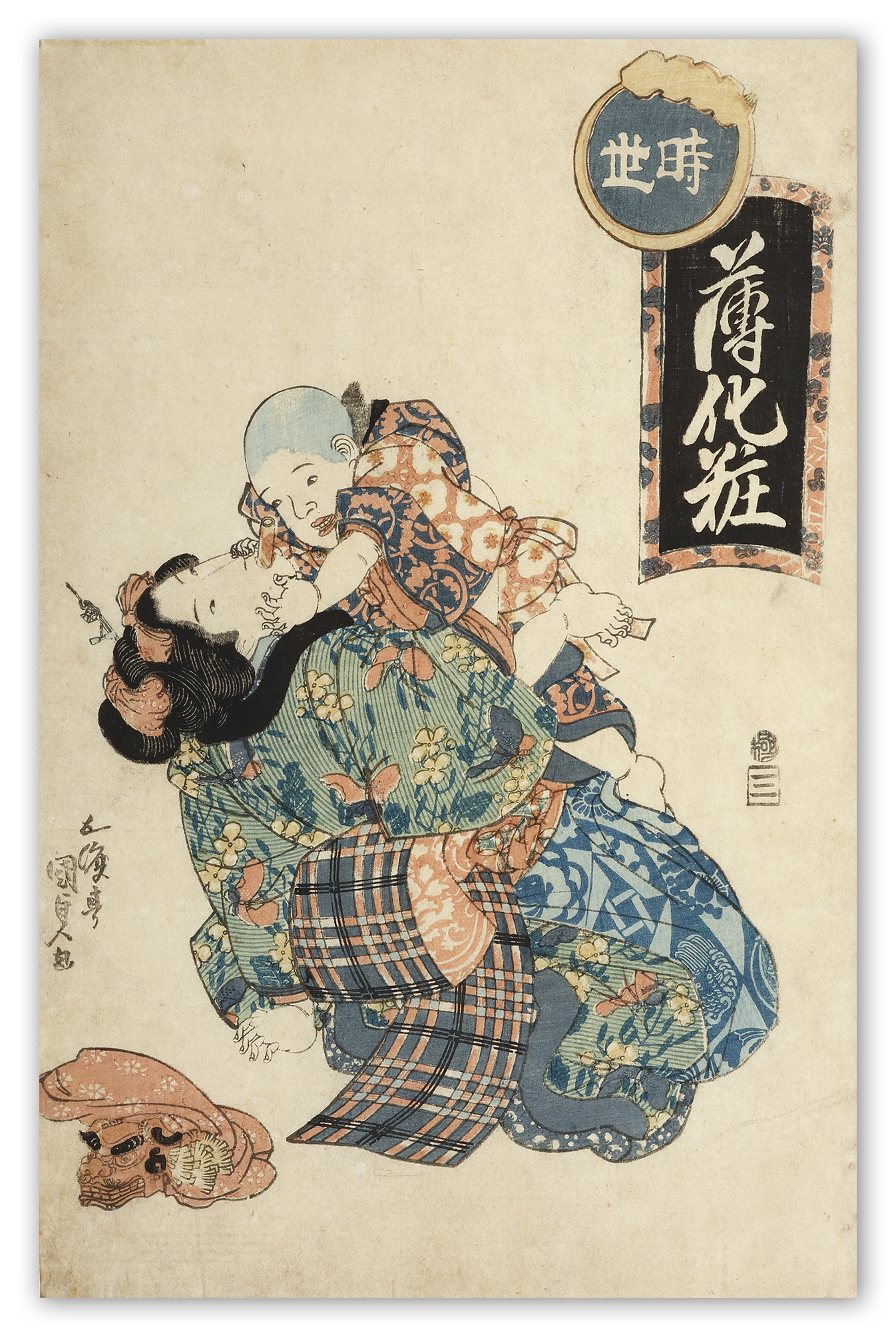 Early c.19th woodblock a baby sitter by Toyokuni the most popular financially successful designer of ukiyo-e woodblock prints in 19th-century Japan.