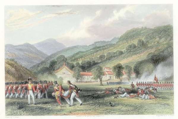 Scarce c.19th hand coloured engraving by Thomas Allom (1804-1872) of the “joss house” (a Chinese temple or shrine) at Chapu (now Zhapu in Zhejiang Province) of the Battle of Chapu which was fought on 18 May 1842 between British forces and Qing Dynasty defenders during the First Opium War. Where the death of Colonel Nicholas Tomlinson , a British officer was killed during the engagement near the joss house.