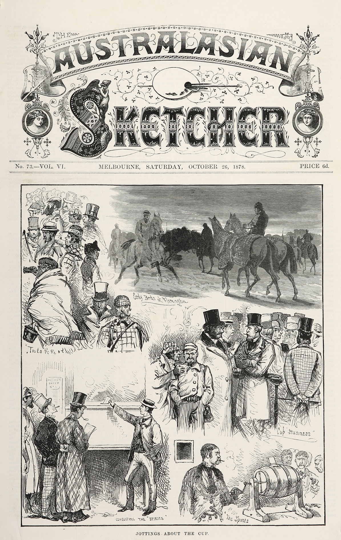 Scarce c.19th engraving showing ‘snap shots’ of  scenes from the 1878 Melbourne Cup. Vignette titles clockwise from top left: 1. Touts etc 2. Early Birds at Flemington 3. Cup “Business” 4. “The Spirits” 5. Consulting the “Spirits” From the original … Read Full Description