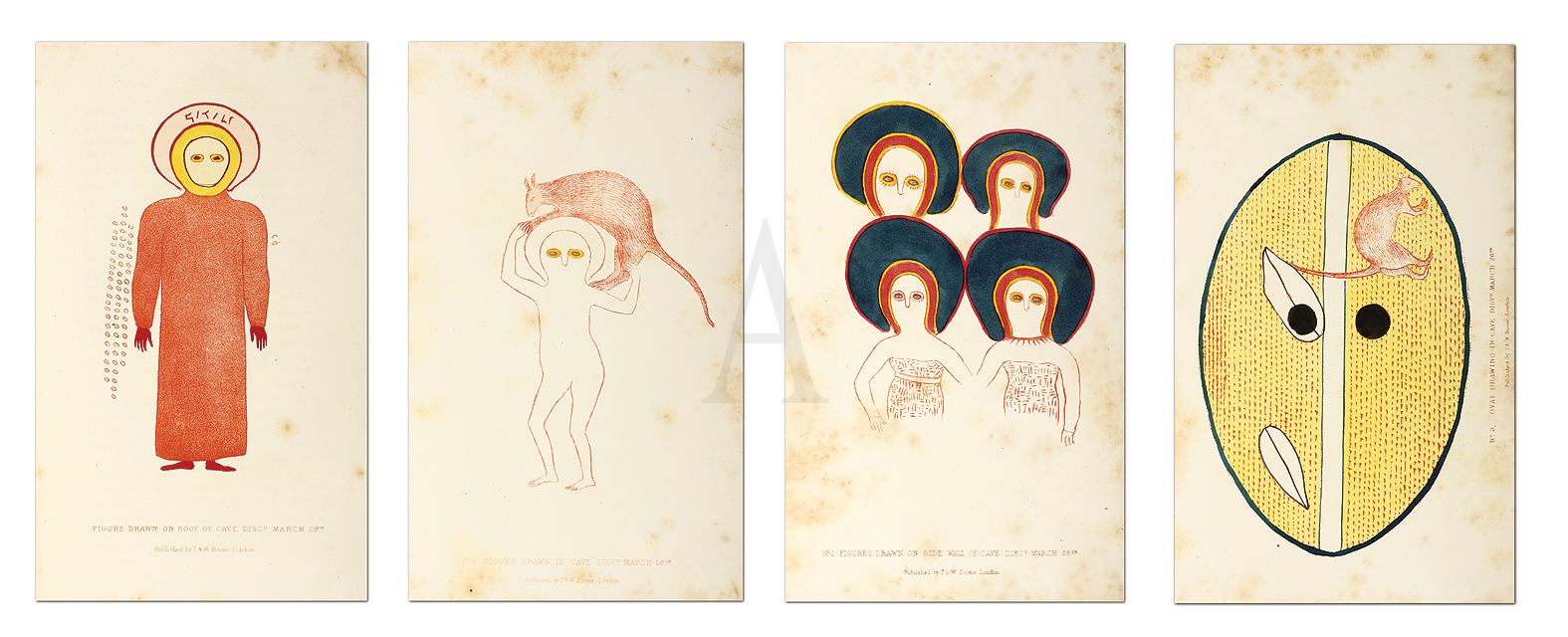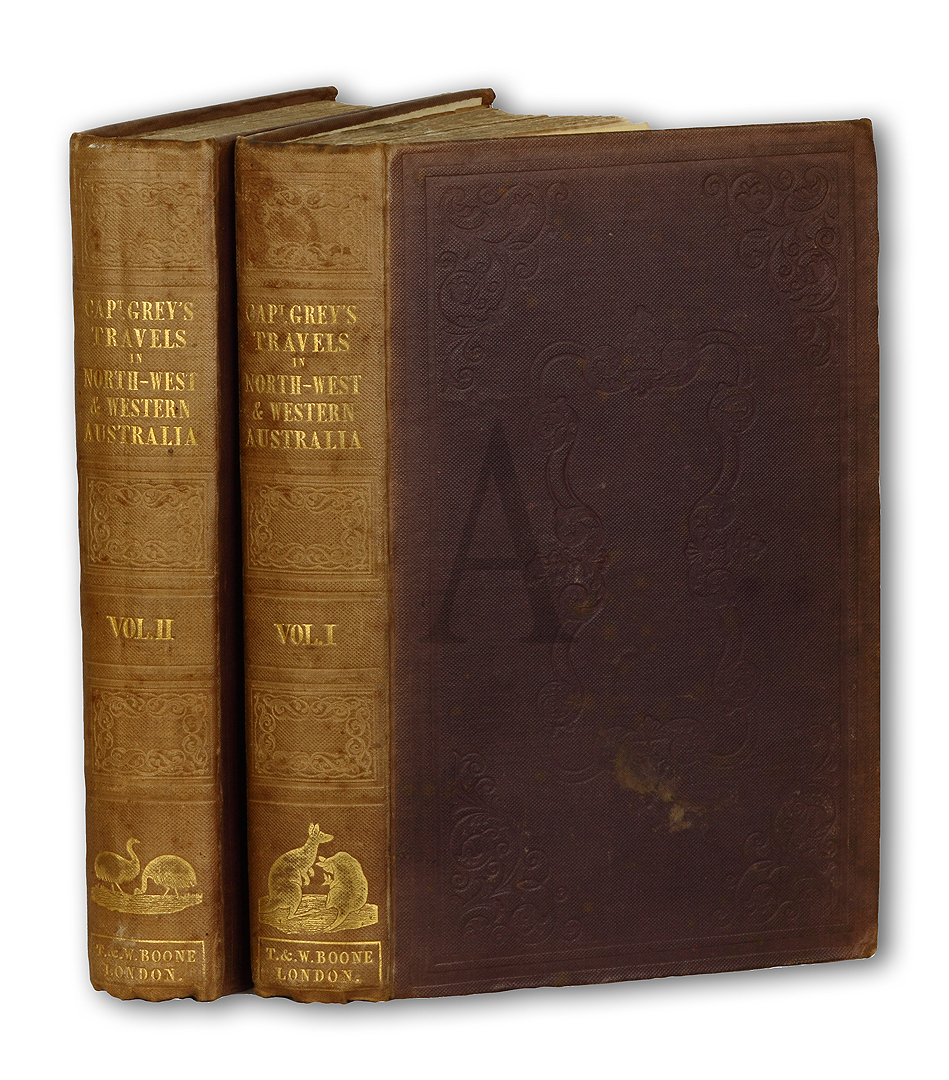 The earliest first issue of this important account of inland exploration of north west Australia in original cloth. Grey’s expeditions were the first to explore the Kimberley’s and report favorably on the quality of the land, which encouraged settlers to the area. He was also the first European to record the Aboriginal rock art known as Wandjina paintings. The expedition embarked on H.M.S. Beagle in July of 1837 arriving off the coast of Australia in December. T & W Boone, London: 1841. First edition. Bound in plum diaper grain cloth, all boards decoratively blind stamped. Spines decorated blind stamped and lettered in gilt, ‘Capt. Grey’s Travels in North-west & Western Australia’. 2 volumes 8vo 4-page advertisement and 16 pages at end of volume I, 2 pages at beginning of volume II. 22 lithographic plates some coloured and with the two rare maps of the “District of Glenelg, on the North-Western Coast of Australia”, and “West Coast of Australia, from Swan River to Sharks Bay”, both with routes marked in red. Corners bumped, spine faded as usual and some light foxing. Owners inscription in blue ink, “Clive M. Eadie?”. A very good copy.