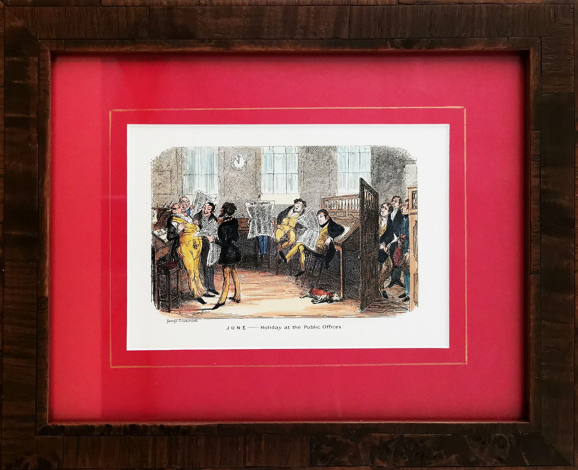 Cruikshank was one of the most prolific illustrators and satirical artists working in England and often referred to as the 'modern Hogarth'. Born in London, a member of the Cruikshank family of caricaturists and artists. His father Isaac was a well-known engraver and caricaturist who taught him etching, watercolor, and drawing. In 1811 while George was still in his teens, he gained popular success with his series of political caricatures that he created for the periodical,The Scourge, a Monthly Expositor of Imposture and Folly. This publication lasted until 1816, during which time Cruikshank came to rival James Gillray, the leading English caricaturist of the preceding era. In fact, because their style was so similar as to be indistinguishable, Cruikshank was employed by Hannah Humphrey, James Gillray's publisher and landlady, to finish plates Gillray was too ill to complete. In the 1820's, Cruikshank began his book illustration period of his career with his most famous being for Charles Dickens's Sketches by Boz (1836) and Oliver Twist (1838). In the 1830's he began campaigning against the abuses of alcohol, especially gin. In 1847 he renounced all alcohol and became an enthusiastic supporter of the Temperance Society in Great Britain. Cruikshank produced a long series of pictures and illustrations, pictorial pamphlets and tracts for the Society. Cruikshank's crusade against the evils of alcohol culminated in The Worship of Bacchus,published by subscription and based on the artist's vast oil painting of the same name, now in the Tate Gallery in London. George conceived the idea for the painting during an 1859 weekly meeting of the Committee of the National Temperance League. He planned a "monumental painting depicting all phases of drunkenness, from beggar to lord and cradle to grave."He began the huge painting in 1860 and completed it in 1862.