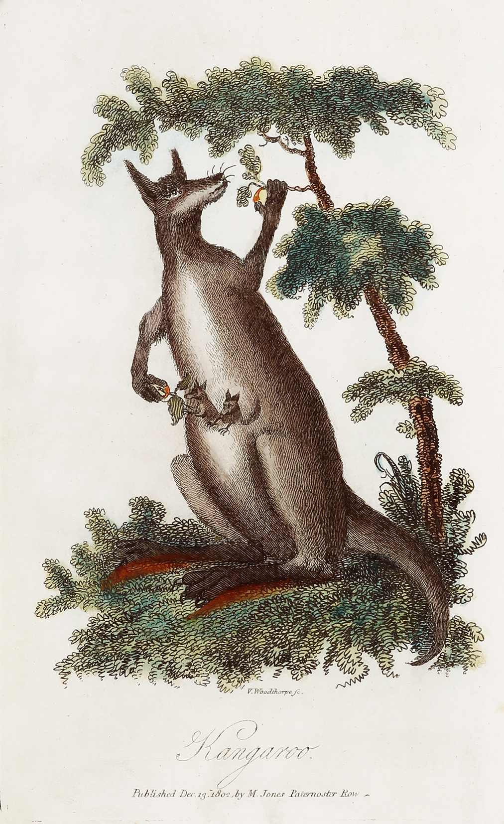 Rare, early c.19th hand coloured engraving of the Eastern Grey Kangaroo charmingly portrayed eating leaves off a tree with a pair of Joey’s in her pouch.