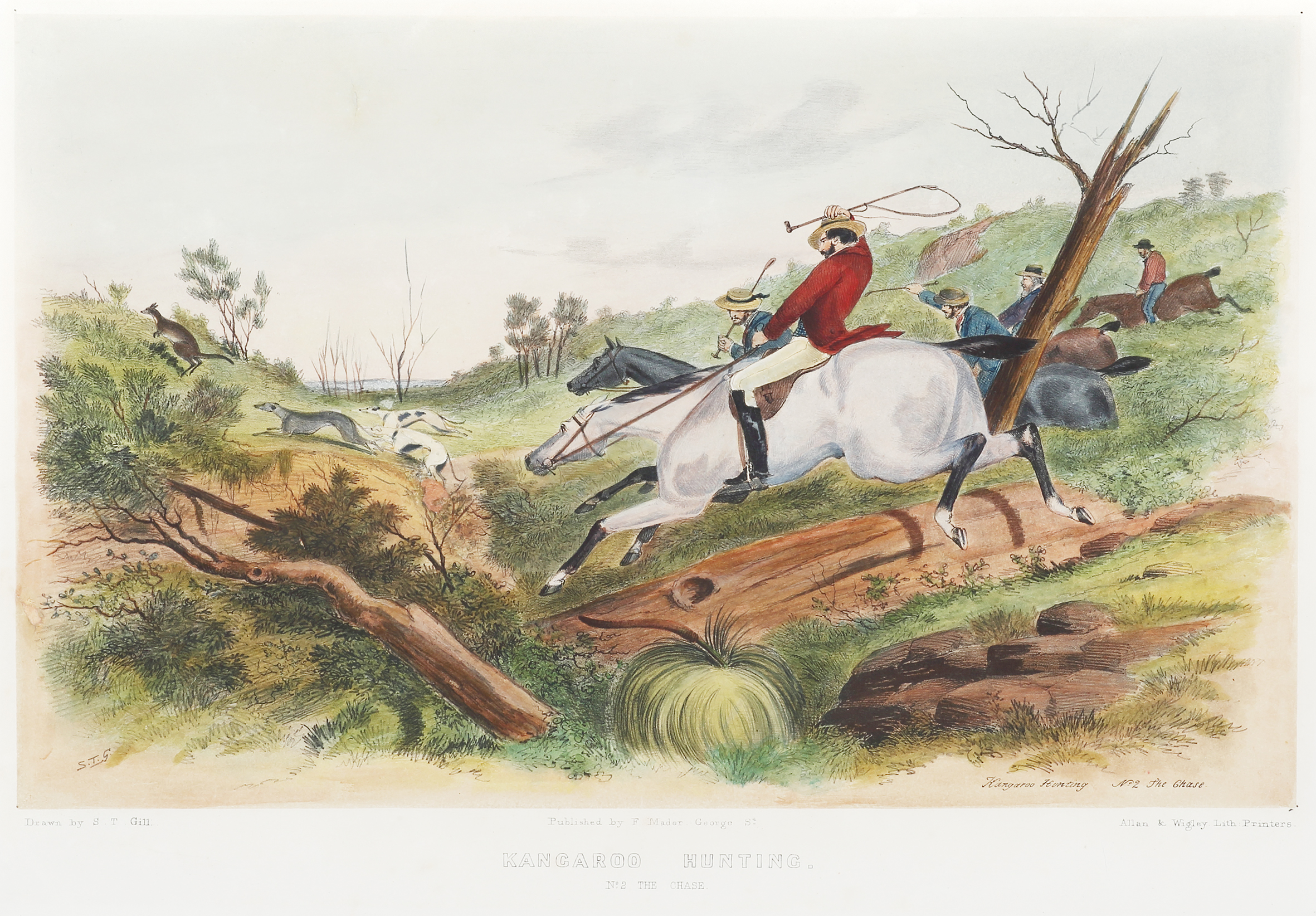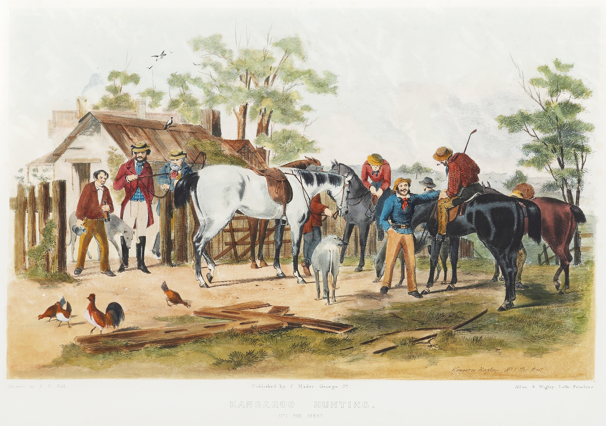 Mr. S.T. Gill, whose reputation in every branch of his art is now so thoroughly established, has cleverly drawn on stone a lithograph ‘No. 1, The Meet,’ repesenting a bush party preparing to go out kanagroo hunting in the interior of Australia. This picture, which is of a torerably large size, is carefully printed on good paper, by Messrs. Allan and Wigley, of this city. The rude wooden hut in the wilderness, slim dogs, and strong, swift horses, with the colonial Nimrods and their attendants, for altogether a very pleasing and lively group.