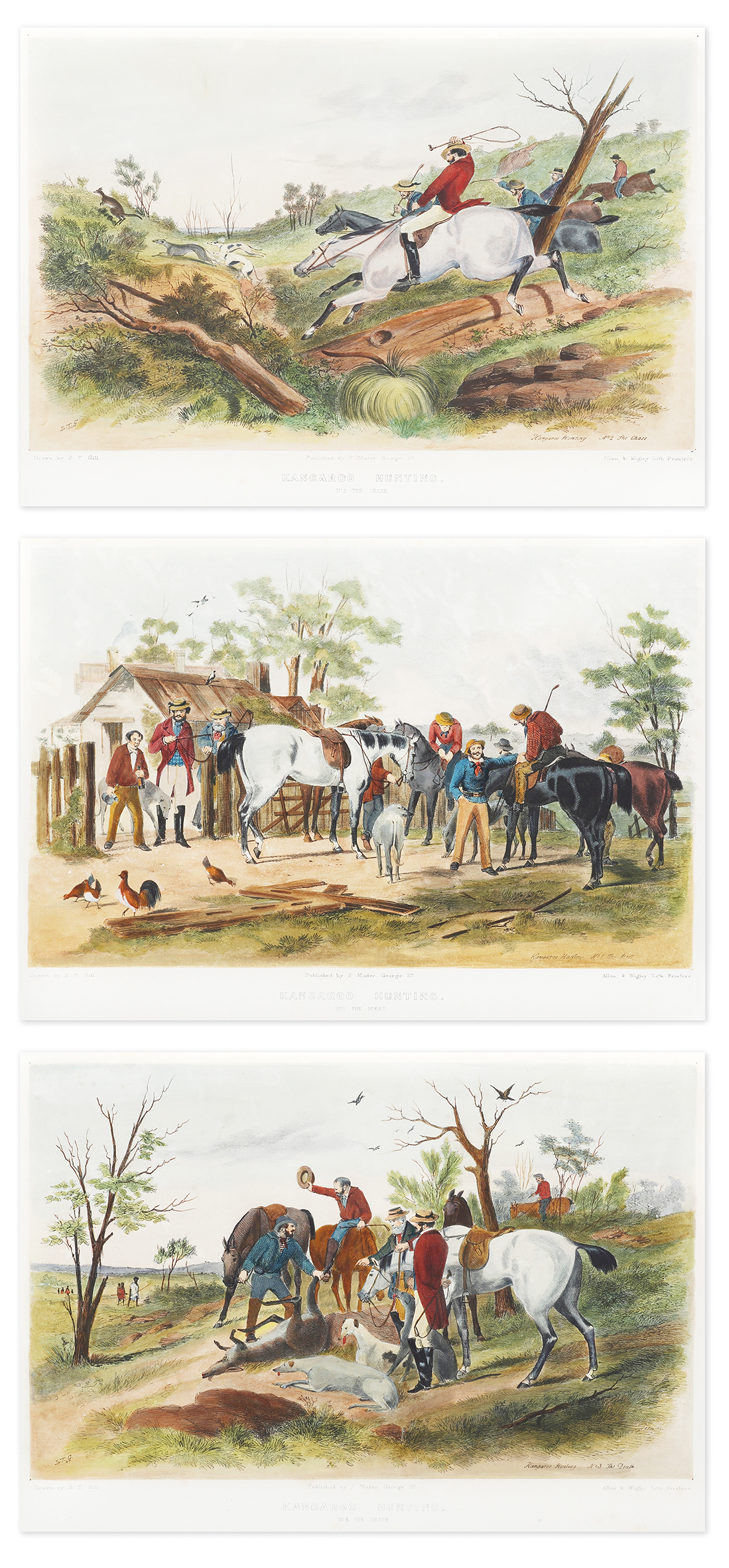 Very rare set of three c.19th hand coloured lithographs of a kangaroo hunt by Samuel Thomas Gill (1818-1880) printed by Allen and Wigley, Sydney..