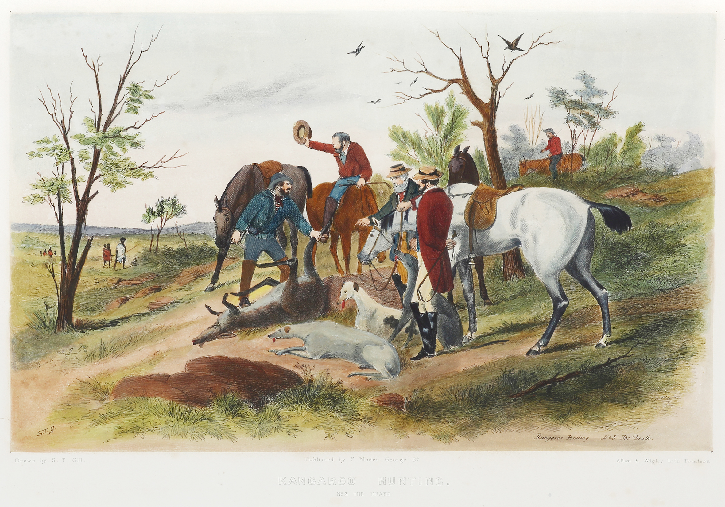 The third print: The Death, Shows a squatter beside his exhausted hounds as a hunter readies his knife to take the dead kangaroo’s tail. Gill on the bay lifts his hat in greeting to a group of approaching Aborigines.