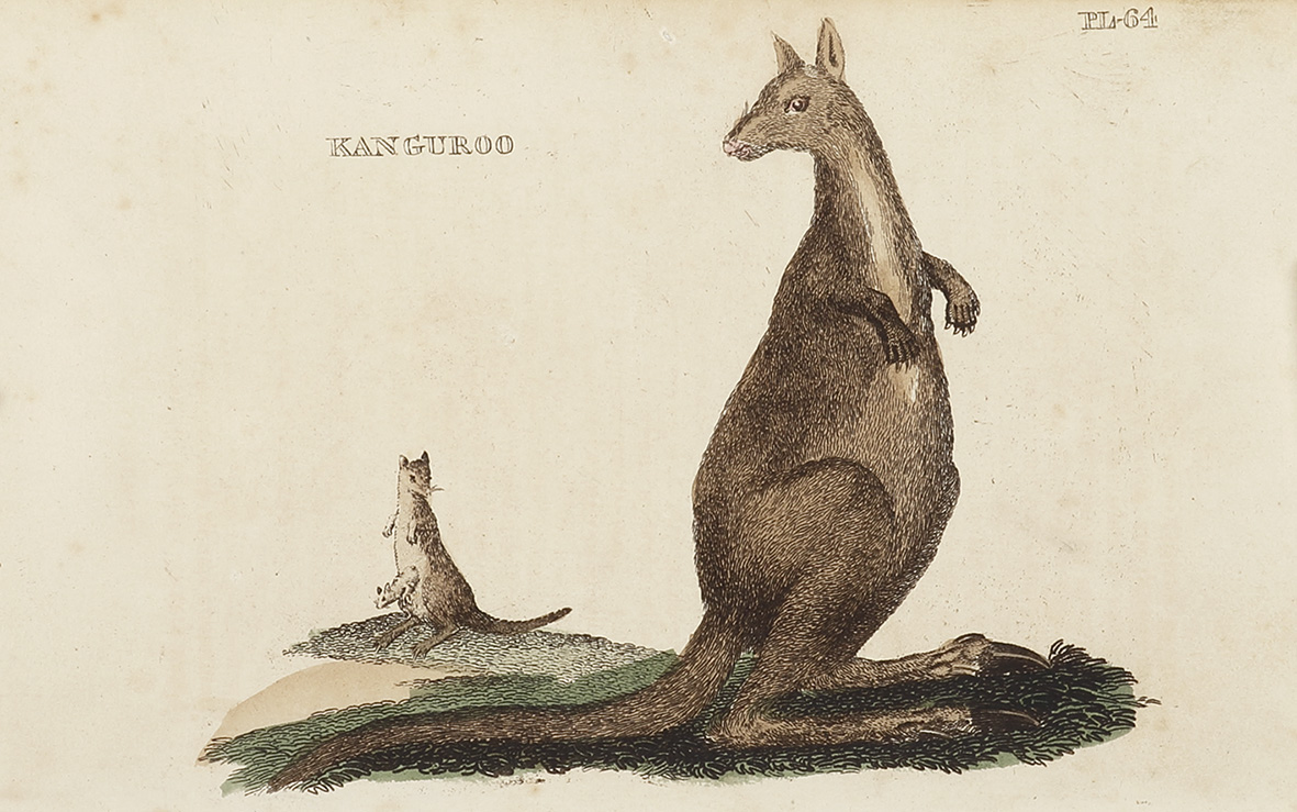 Early c.19th engraving of a kangaroo, the female is shown with a Joey in its pouch. The pose with head turned to the left and paws close to its chest is based on the first image of the Kangaroo made by George Stubbs and published as an engraving in the accounts of James Cook’s first voyage in 1773.