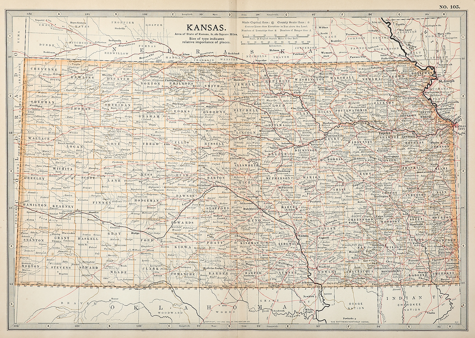 Detailed early coloured printed engraved c.20th map of Kansas. Collections: Library of Congress: tmp82010366 National Library Australia: Bib ID 2243430 National Library Scotland: E18 State Library New South Wales: Record Identifier 74VMbm46b8Xg State Library Victoria: Library YA ; 032 EN1