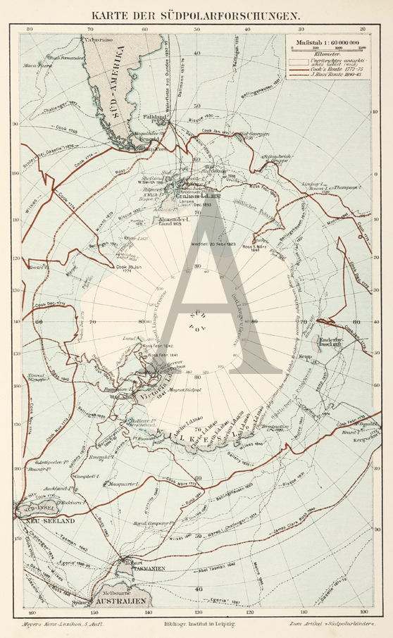 Detailed map of Antarctica with numerous explorers tracks including, Cook, Balleny, Bellingshausen, Nares, Tasman, etc
