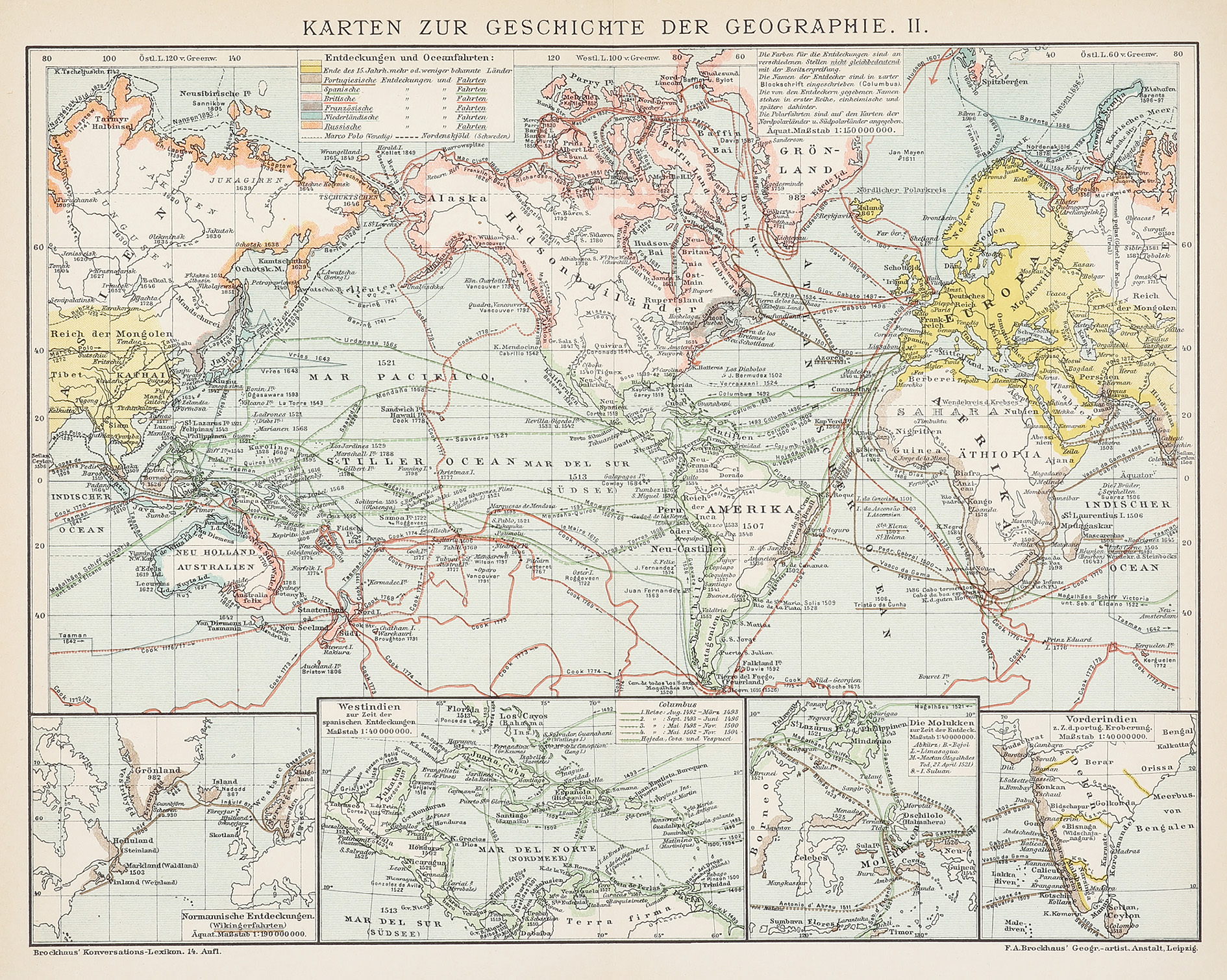 Interesting map showing the parts of the globe discovered by different nations. Australia shown with blue outline in the northern through to the southern coasts and being discovered correctly by the Dutch and the east coast by the English. The map also includes numerous explorers tracks.