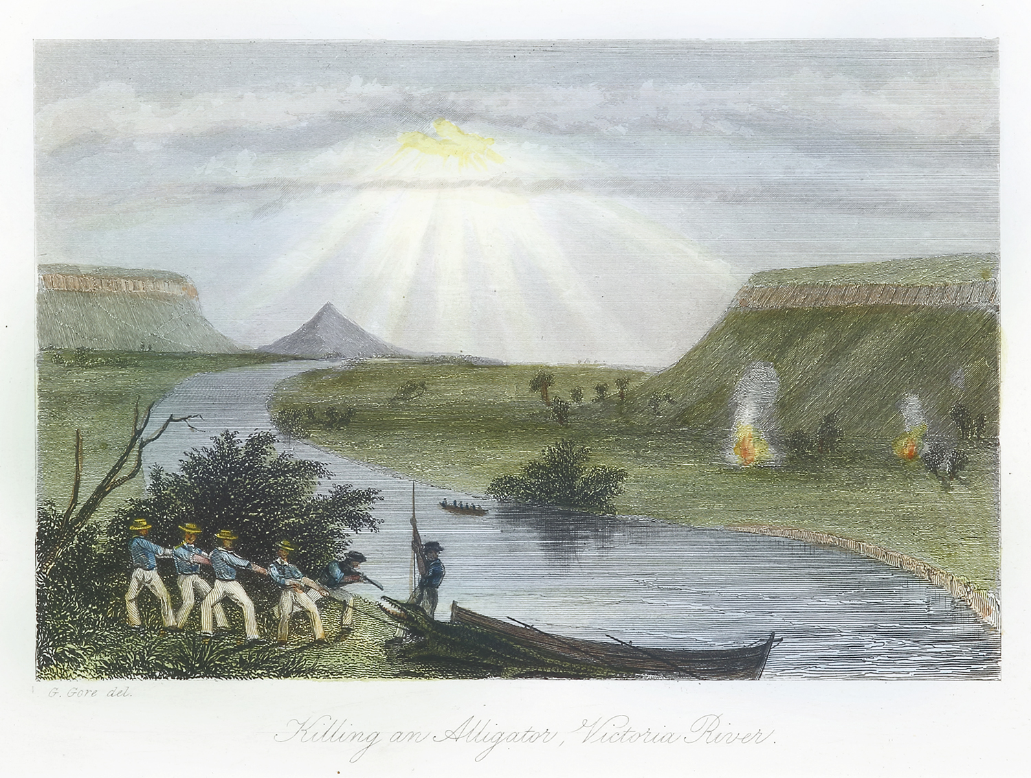Rare engraving showing the crew killing an alligator on the Victoria River, Northern Territory while on  the 3rd expedition of the Beagle, 1837-1843. Stokes recounted that the crocodile took six shots before finally dying and that this scene represented the … Read Full Description