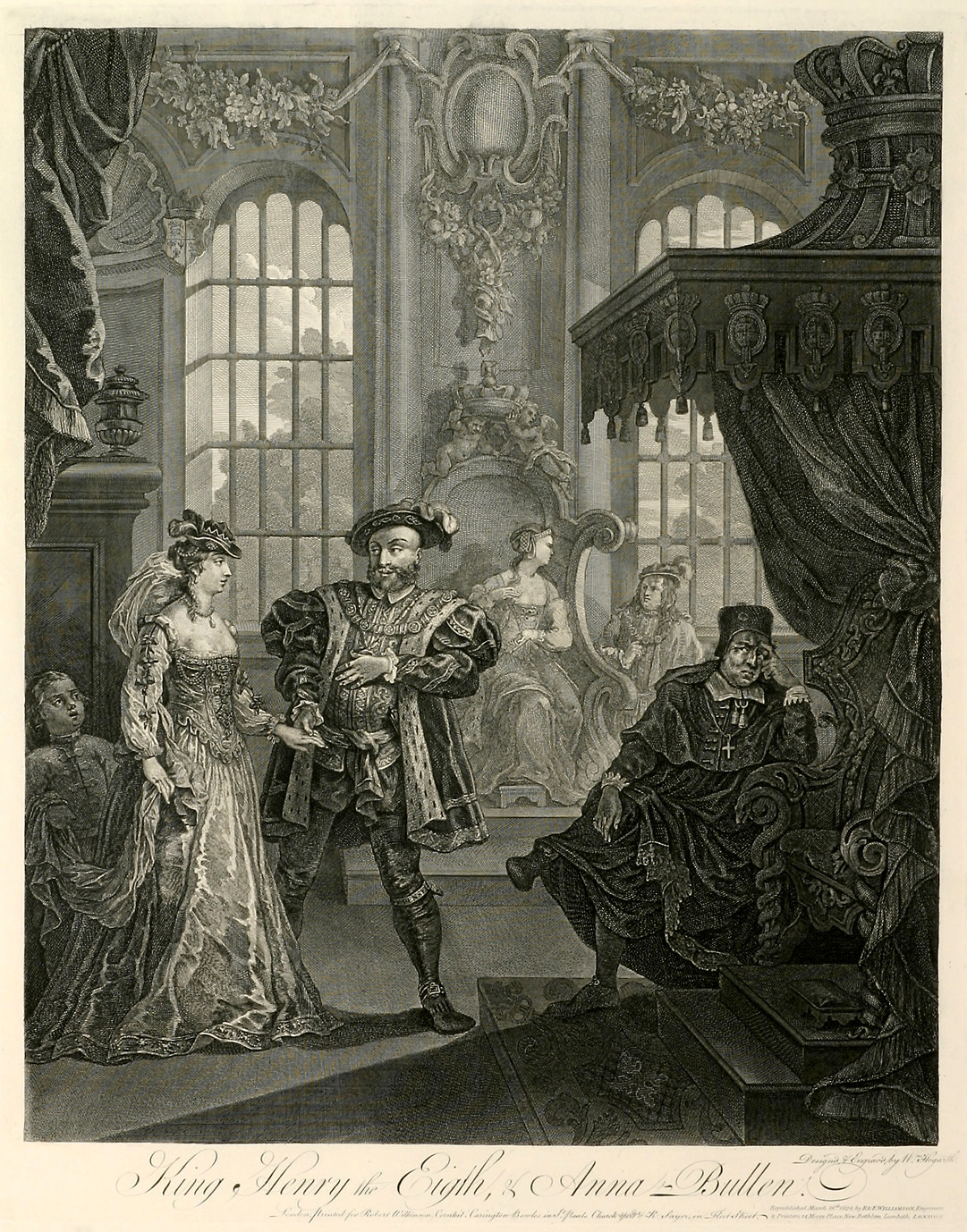 In this image Hogarth depicts Henry the VIII talking to Anne Boleyn at court, with a slightly despairing Cardinal Wolsey at right of picture.