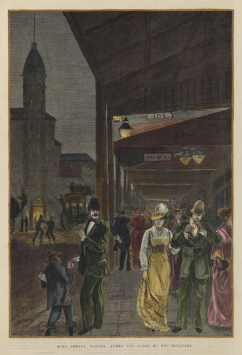 Rare colonial engraving showing a crowd walking out of the theatres in King Street, Sydney. From the original edition of the Illustrated Sydney News.