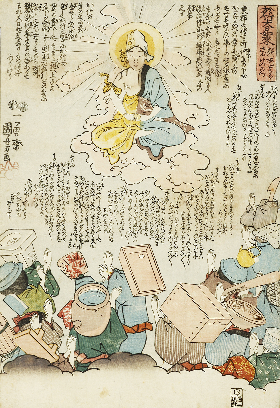Otake (Otake Dainichi Nyorai) was a humble maidservant of the Sakuma family in Odenma-cho in Edo, who was known for the extreme diligence she brought to even the most menial chores. A group of mountain ascetics, who were searching for the reincarnation of the Nyorai Buddha, found her. When she bent down to pick up a few grains of rice that had fallen on the floor, a halo-like light surrounded her, convincing the ascetics that they had come upon a divine being. From April to October, 1849, the Ekôin temple in Ryôgoku held an exhibition of sacred objects related to Otake, called a degaichô. Otake is often portrayed with an object behind her head that resembles a halo, or with a shadow or reflection identifying her as a divine being.