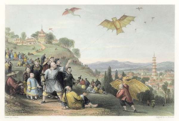 Kite-flying at Hae-kwan, on the Ninth Day of Ninth Moon. - Antique Print from 1840