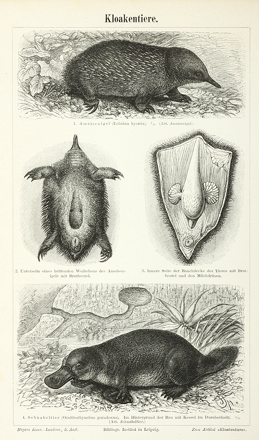 C.19th German engraving of Australia’s unique echidna and platypus.