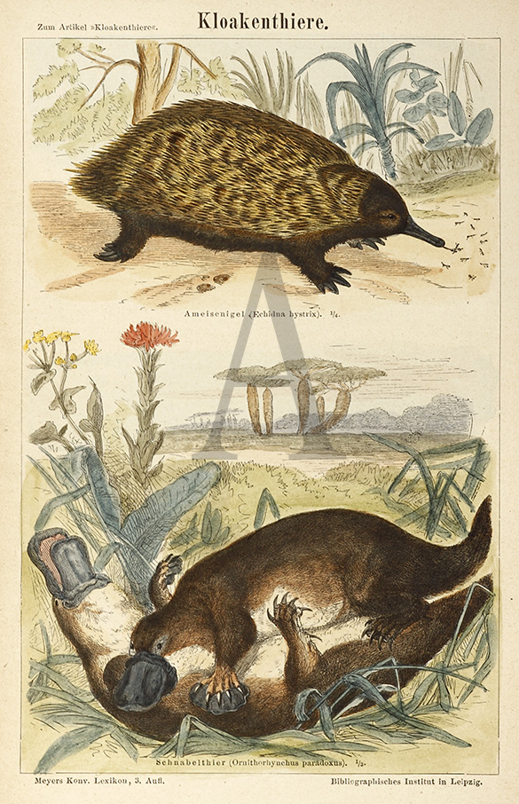 Bertuch in volume 3 of his Bilder Buch fer Kinder published in 1798, contained an illustration of the Platypus, (Plate LXIV) and inluded a description and used the classified name given by the German naturalist, Johann Blumenbach’s, which had not been published by Blumenbach at that time. Blumenbach had classified the Platypus as Ornithorhynchus paradoxus and published his description and illustration in his Abbildungen naturhistorischer Gegenstande, v.5, no.41 in 1800 two years later than Bertuch’s. Blumenbach had been unaware that George Shaw had already given it the name Platypus anatinus. However, Platypus had already been shown to be used for the scientific name for a genus of Ambrosia beetles so Blumenbach’s scientific name for the genus was used.
