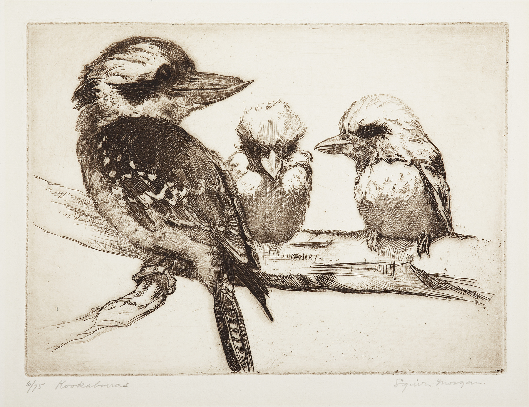 We also own the original pencil drawing, proof etching and an etching 2 of 75 sold as a set of three, see; https://antiqueprintmaproom.com/product/kookaburras-james-squire-morgan/