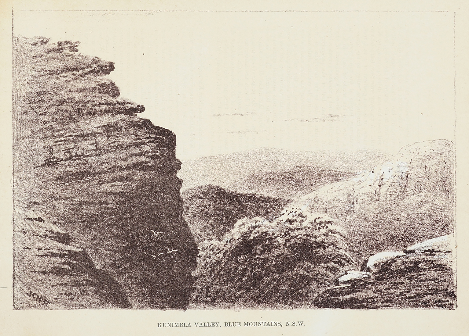 Scarce c.19th sepia lithograph of Kunimbla Valley, Blue Mountains, by John Campbell Hoyte (1835–1913).