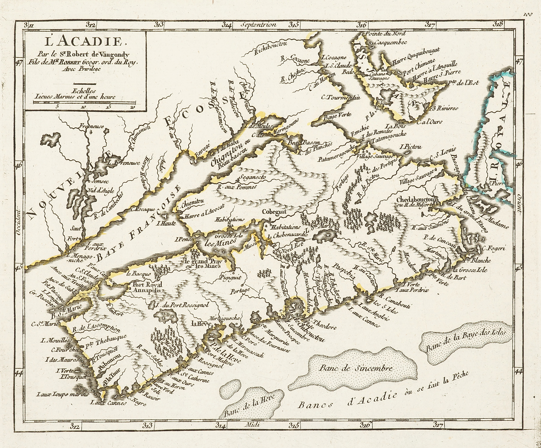 Scarce c.18th French hand coloured engraved map of Acadia by Robert de Vaugondy (1688-1766).