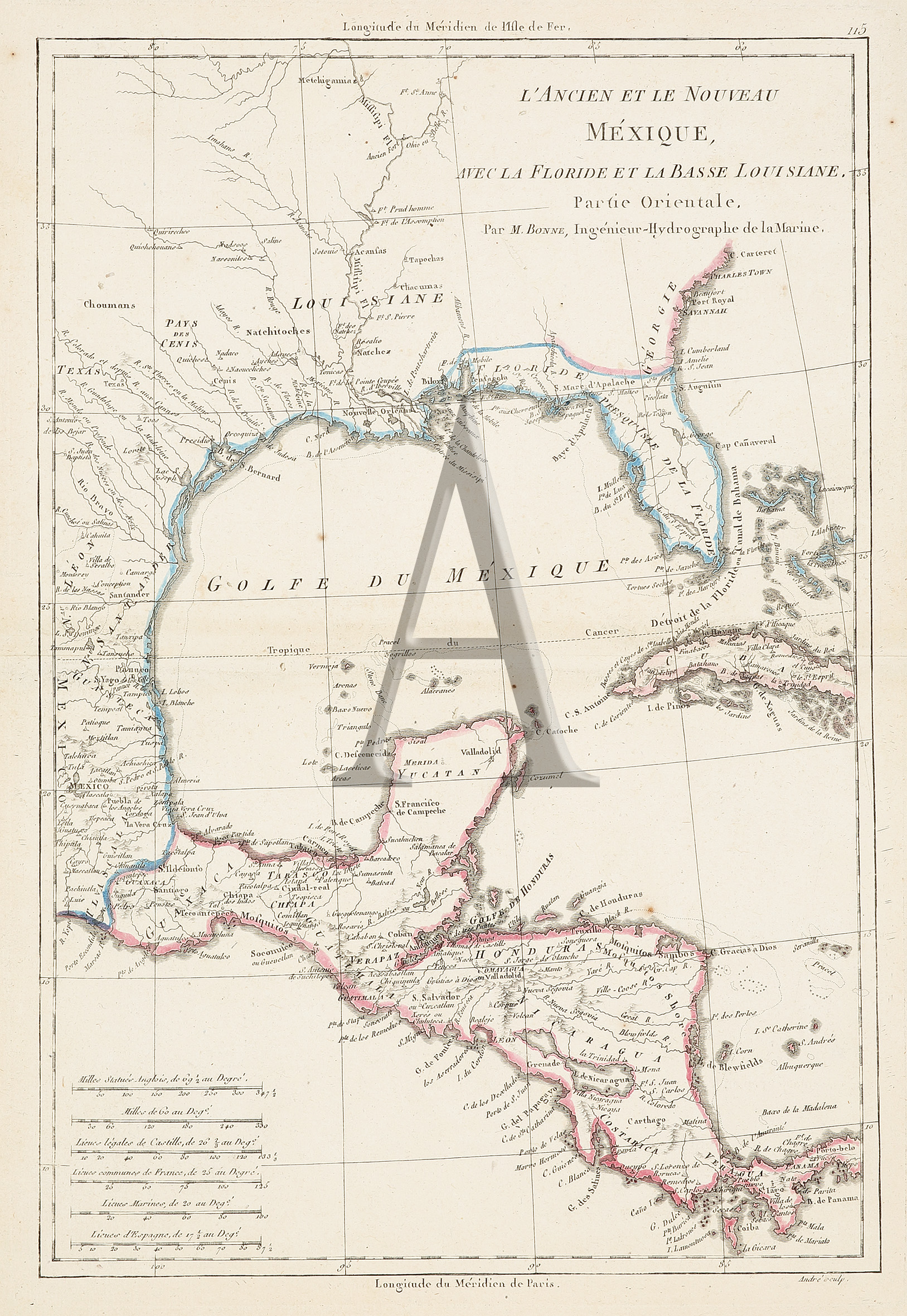 Scarce map of the Gulf of Mexico showing the coasts of Florida, Louisiana, Mexico and down into Central America. From Bonne’s, Atlas Encyclopedique, Contenant La Geographie Ancienne, et Quelques Cartes sur La Geographie du Moyen Age, La Geographie Moderne, et … Read Full Description