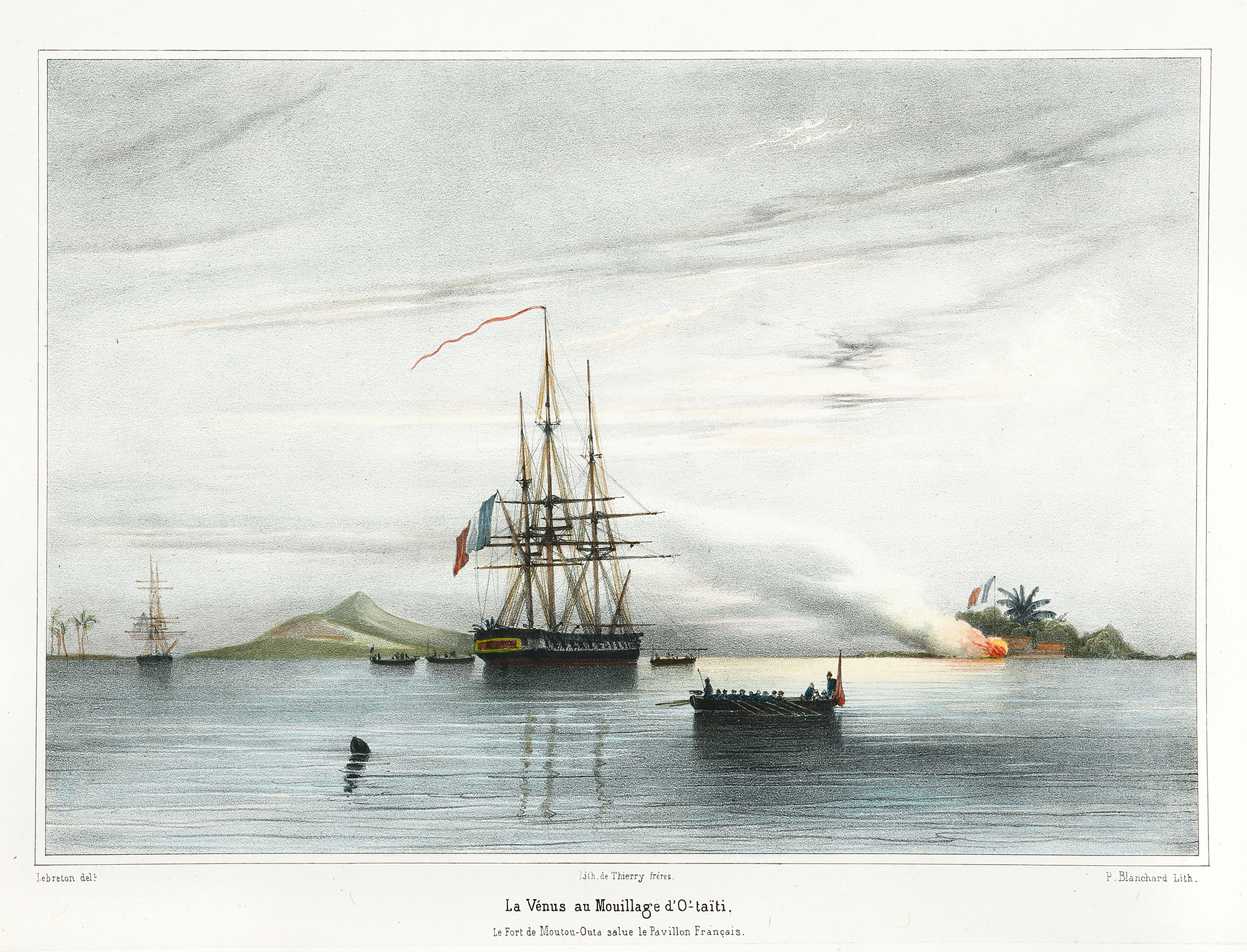 After the Venus’s stay at the Marquesas Islands the expedition arrived at Tahiti on 28/8/38. Within three days, after threats of vio.ent retalition against the British resident, Reverend George Pritchard, the Amercian consul, Jacques-Antoine Moerenhout abd queen Pomare, he had fulfilled his instructions and obtained from the queen a most favoured nation agreement under which French Nationals were guaranteed rights of residence in Tahiti. On 10/9/38 he sailed to Matavai Bay, where he had heard that the Astrolabe and Zelee had arrived with the expedition of Dumont d’Urville whose presence added further weight to the French cause. Dupetit Thouars spent the next two weeks on hydrographic work.