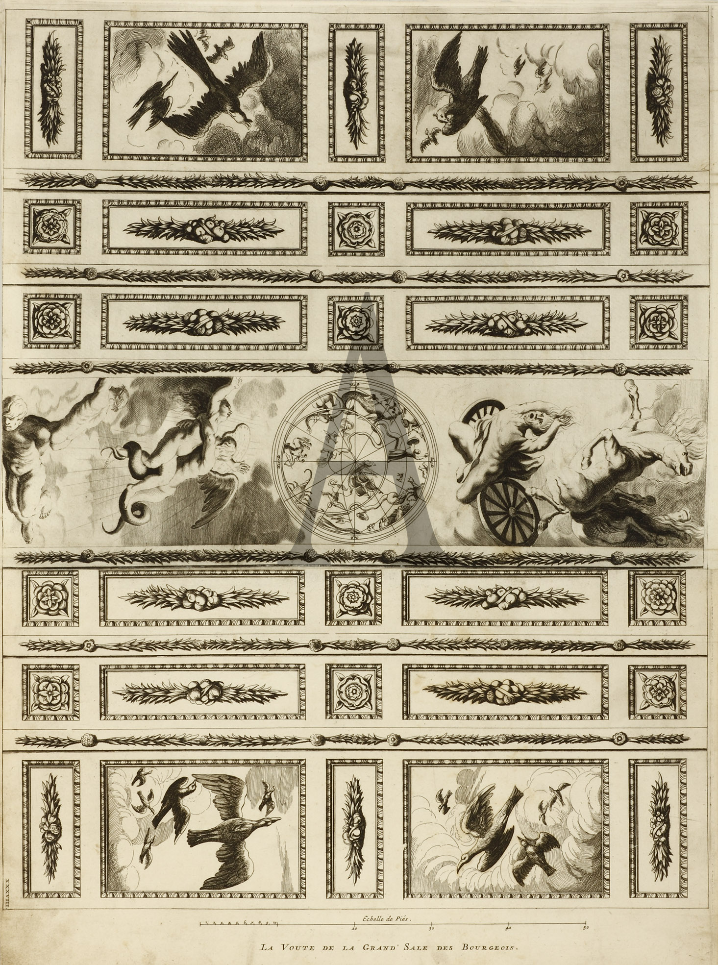Superb large C17th engraving of the vault of the Grand Sale des Bourgeois, Amsterdam, the centre and ultimate destination of the fabulous profitable spice trade run by the V.O.C.