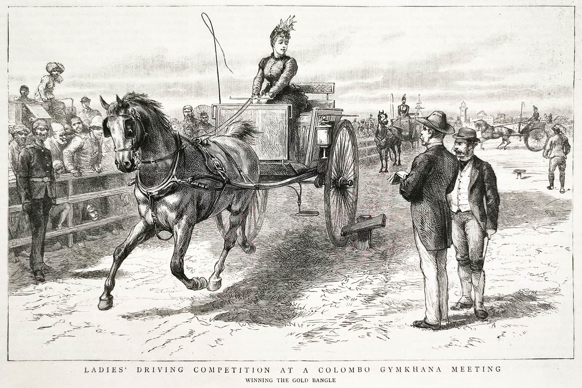 Engraving of a ladie’s driving competition in Sri Lanka. From the original edition of The Graphic.