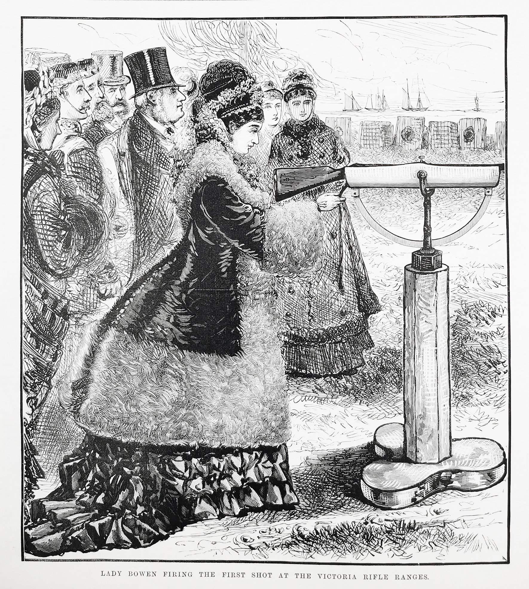 Engraving of lady Bowen shooting a rifle. From the original edition of the Australasian Sketcher.