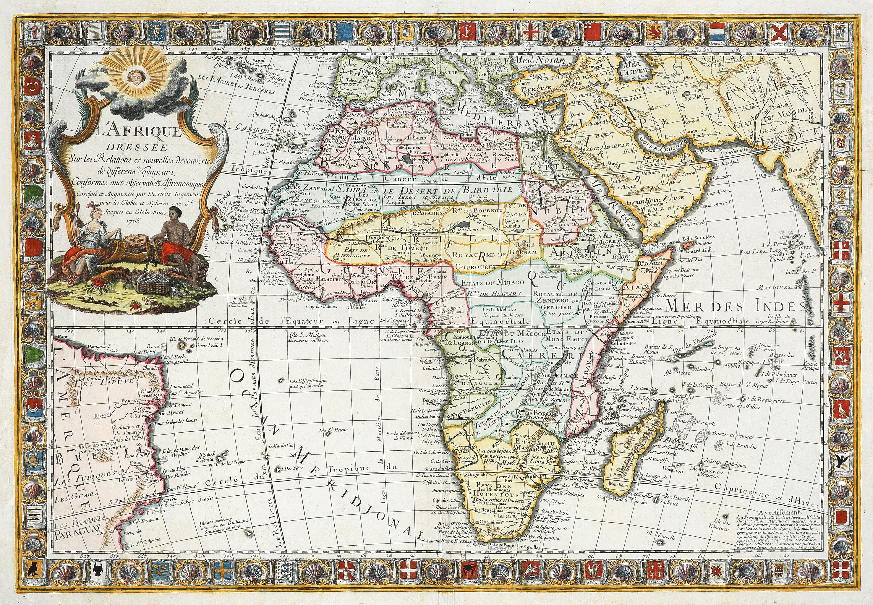 Spectacular rare, large separately issued c.18th map of Africa by Guillaume Danet, embellished by a border of dozens of coats of arms showing the various states and countries, published by Louis Charles Desnos in Paris.
