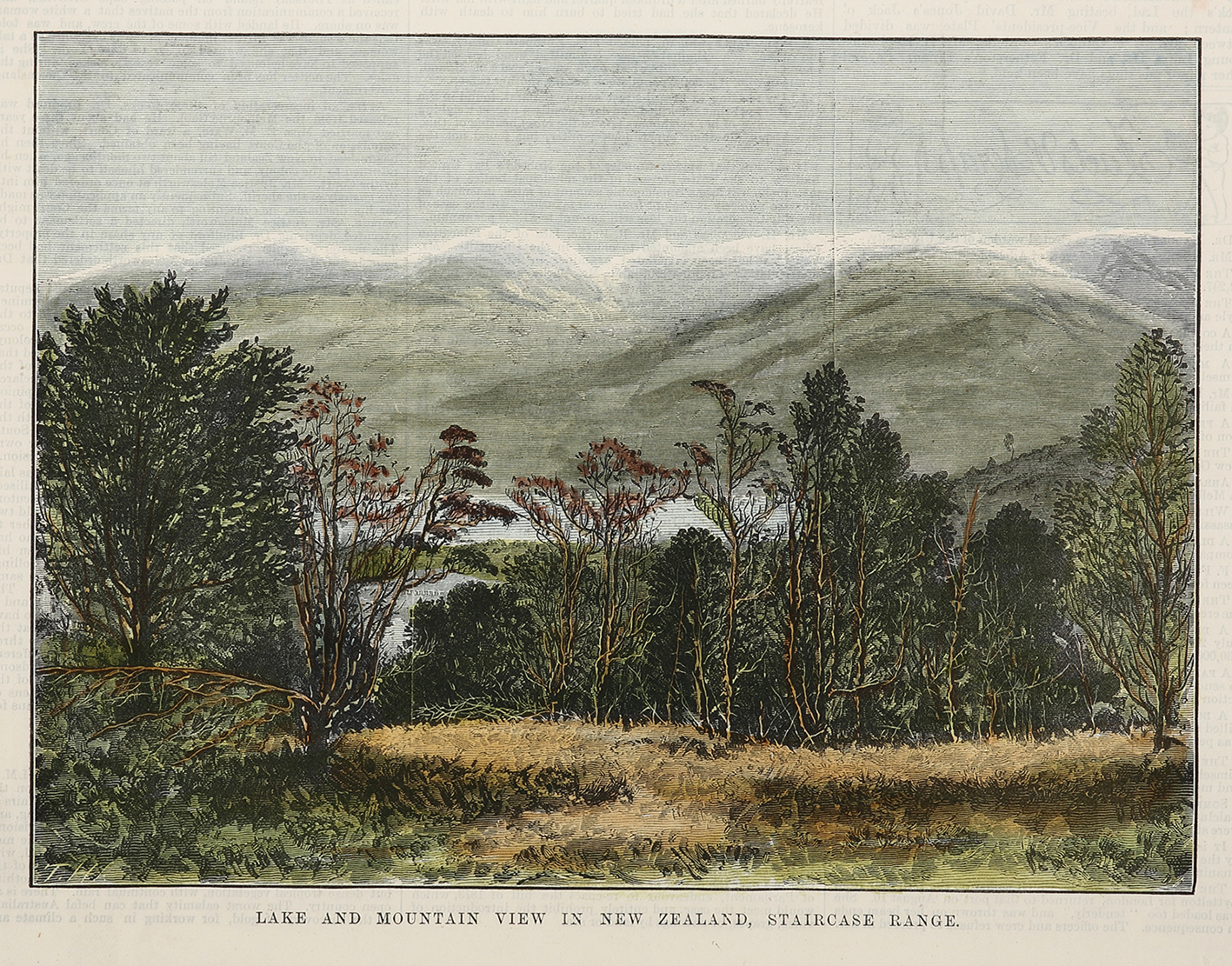 Scarce c.19th hand coloured engraving of the Staircase Range, New Zealand. From the original edition of the Australasian Sketcher. Collections: National Library Australia: Bib ID 914558 State Library New South Wales: REF1/MAV/FM4/9236-9239 State Library Victoria: PCINF AS 06-09-73 P.104