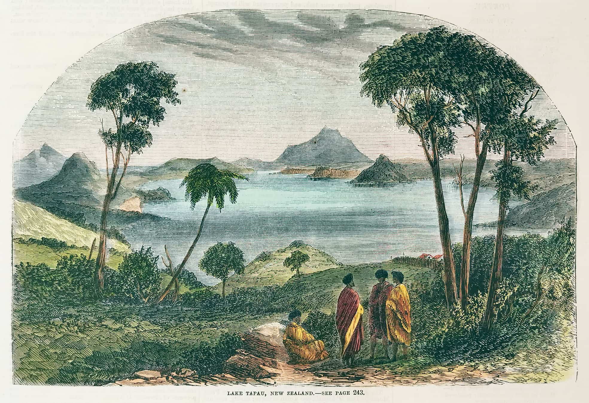Rare early colonial engraving of Lake Taupo with a group of Maori in the foreground. From the original edition of the Illustrated Sydney News.