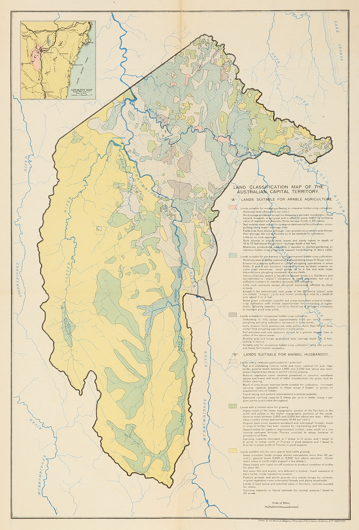 Detailed map of the Canberra district showing land utilization in colour with an accompanying colour key. Also shown are Drainage features, district boundaries, roads, tracks and railways dated 1953 at lower right.