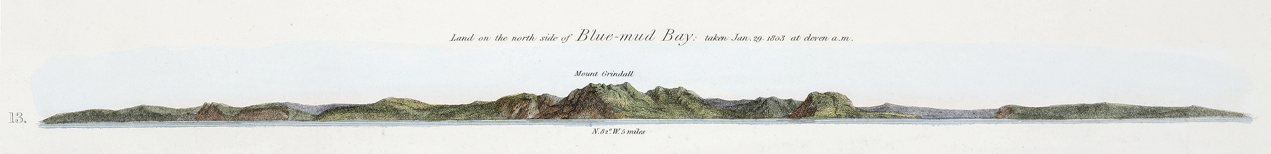 Whilst the botanists continued to follow their pursuits upon Point Blane, I went over in the whale-boat to Mount Grindall, with the landscape painter; from whence, after cutting down some small trees at the top, my view extended over all the neighbouring islands, points, and bays. Blue-mud Bay was seen to reach further north than Mount Grindall, making it to be upon a long point, which I also named Point Grindall, from respect to the present vice-admiral of that name; further west, in the bay, was a stream running five or six miles into the land, terminating in a swamp, and with shoal banks and a low island at the entrance; all the northern part of the bay, indeed, seemed to be shallow, and to have no ship passage into it on the north side of Isle Woodah. The large bight between Points Grindall and Blane extended two leagues above the ship, but it did not appear to receive any stream of water; a still larger bight, between Point Blane and Cape Shield was also visible, though not so distinct as to speak of it particularly: the extremity of the cape bore S. 76° 15’ E. An observation to the north and south, taken on the outermost rocks, places Mount Grindall in 13° 15½’ south; and the longitude from survey is 136° 6 1/3’ east. Mr. Westall’s sketch in the Atlas, taken from the ship at anchor under Point Blane, will show the appearance of this mount and of the neighbouring land. (Atlas, Pl. XVIII. View 13.)’