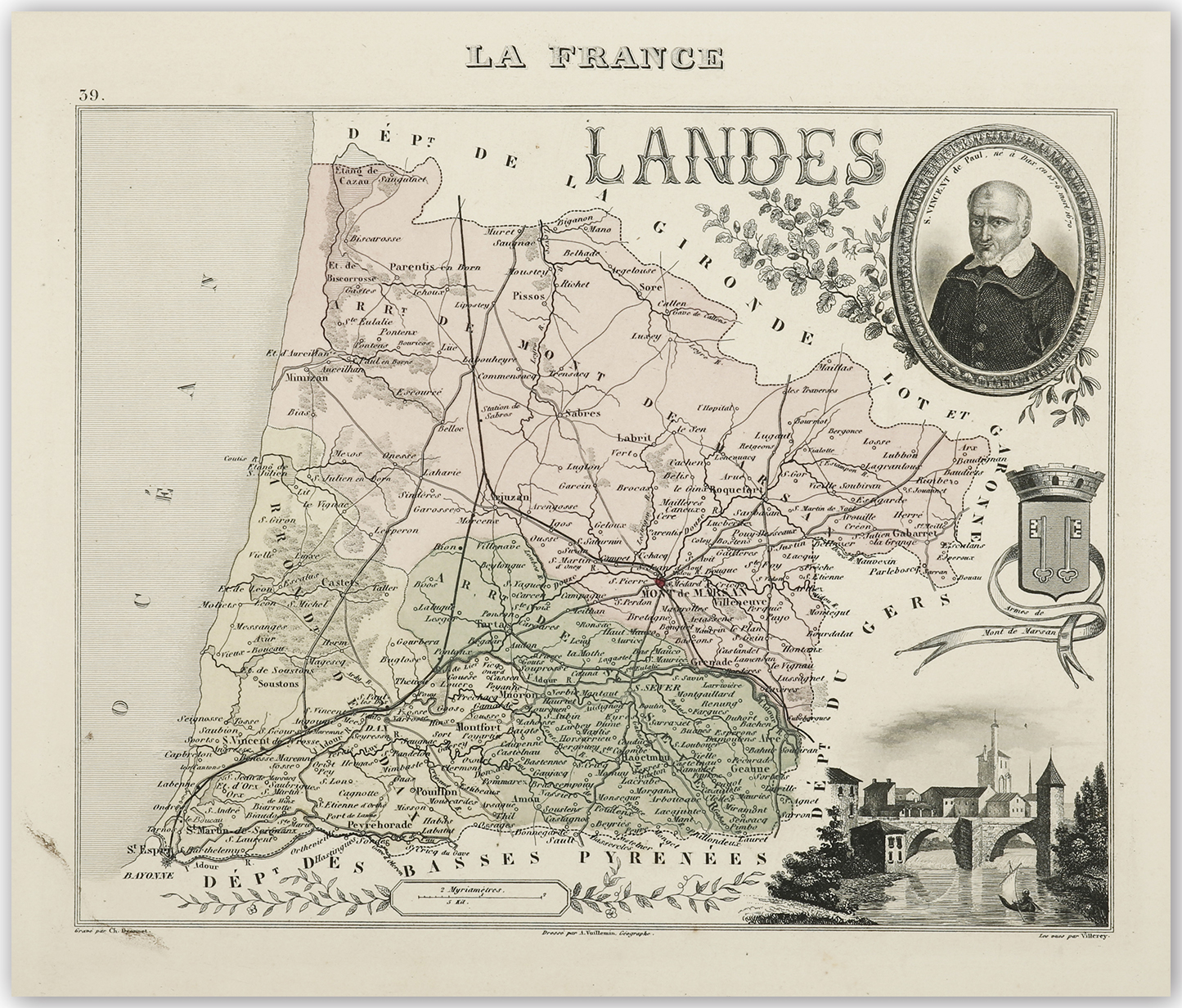 Decorative C19th map of Landes including vignettes of a portrait of St Vincent de Paul and view of Mont de Marsan.