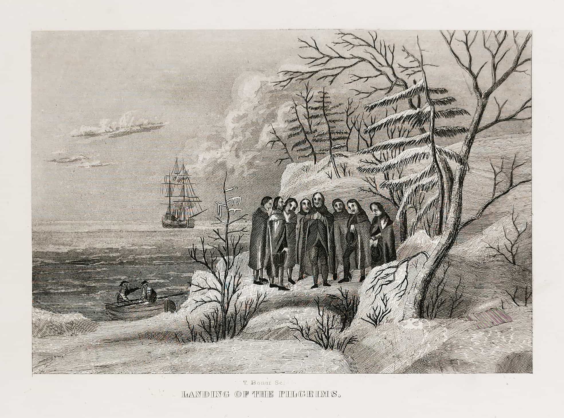 Engraving showing the lading of the pilgrims in the USA.